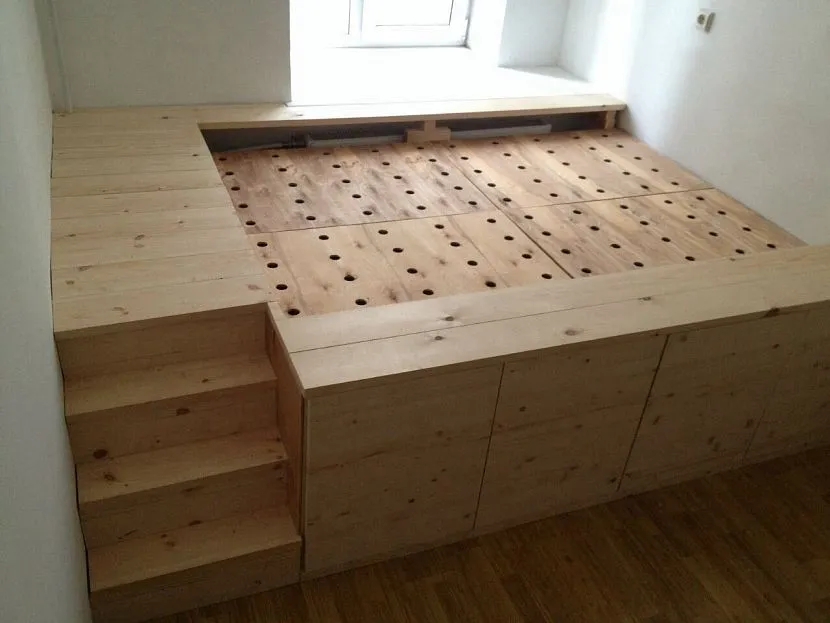 Последний вариант конструкций часто устанавливается в маленьких комнатах, где важно рационально использовать каждый сантиметр пространства. Здесь можно в подкроватной зоне оборудовать вместительную систему хранения вещей