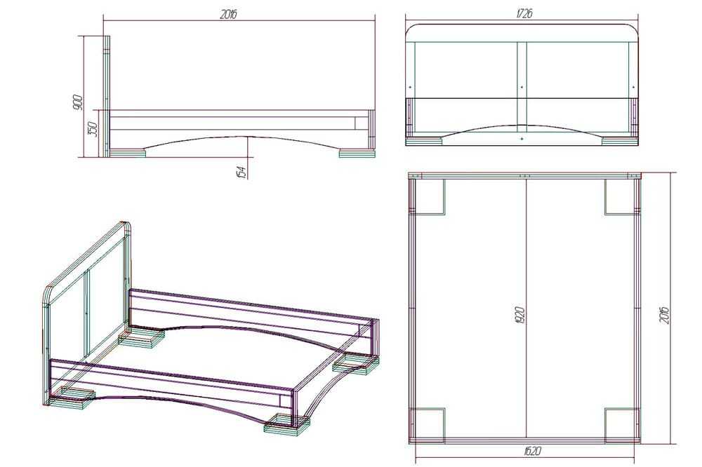 Для самостоятельного составления схемы необходимо отложить на листе бумаги отрезки, равные длине, ширине и высоте изделия, а затем прорисовать форму и обозначить габариты каждой детали отдельно. Такая деталировка необходима для дальнейшего распила материала. Значительно упростить работу способны компьютерные программы и онлайн-ресурсы, создающие макет по замерам пользователя автоматически. Еще один вариант – найти готовый чертеж кровати и подогнать параметры, строго соблюдая все пропорции.