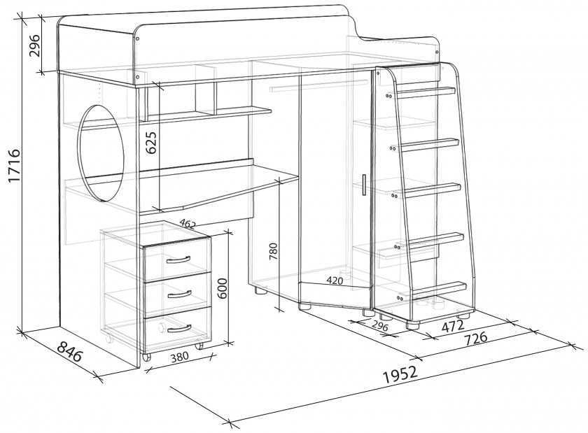 - Расположение дополнительных атрибутов (лестницы, ограничительных бортиков, съёмного изголовья и ящиков для хранения вещей).