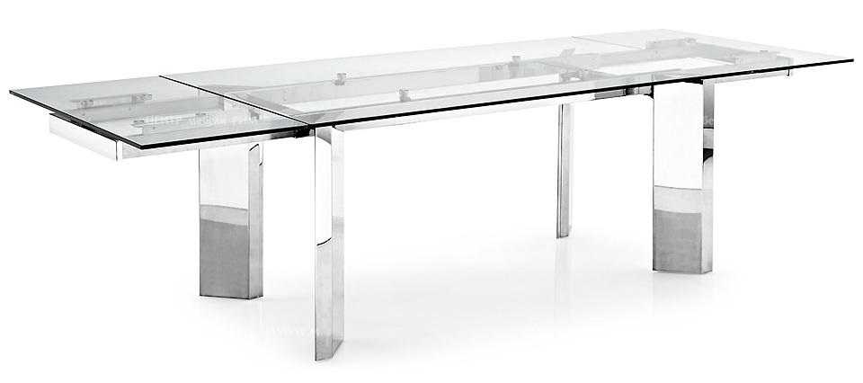 Трансформация такой мебели осуществляется с помощью полозьев, по которым основные элементы конструкции раздвигаются в разные стороны. Раздвижной стол может быть оснащен минимум 4 и максимум 8 ножками. Вставки при этом оказываются спрятанными в углубление, расположенное под поверхностью конструкции. Также их можно хранить отдельно, например, в шкафу. Для изготовления крепежей и механизмов используется металл, не поддающийся окислению.
