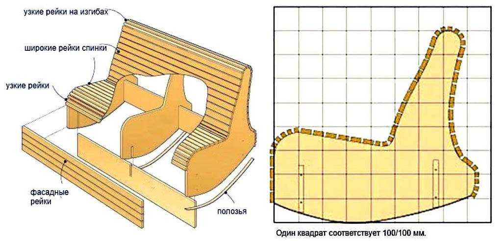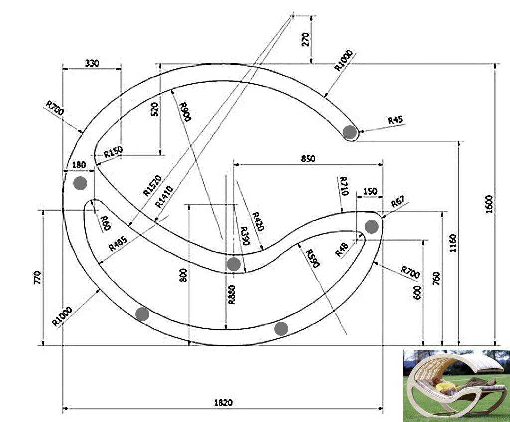 Как и в предыдущем случае, с готового чертежа при помощи «миллиметровки» прорисовываются детали будущего кресла-качалки из фанеры, в нашем случае это боковые части (полозья).