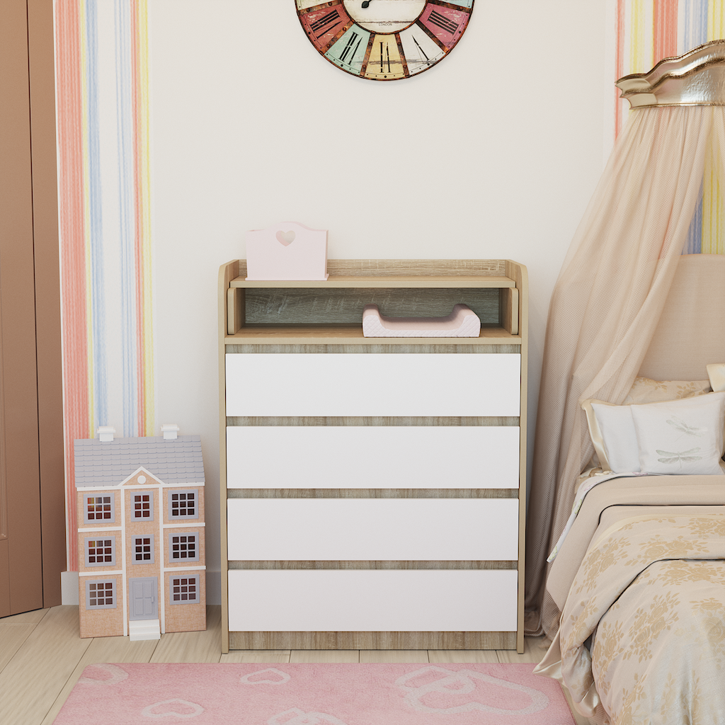 - пеленальный комод подойдёт для тех, кто не собирается использовать разные поверхности для ухода за ребёнком, разместив все нужные вещи в полочках комода – можно легко сменить подгузник и переодеть кроху, не сходя с места;