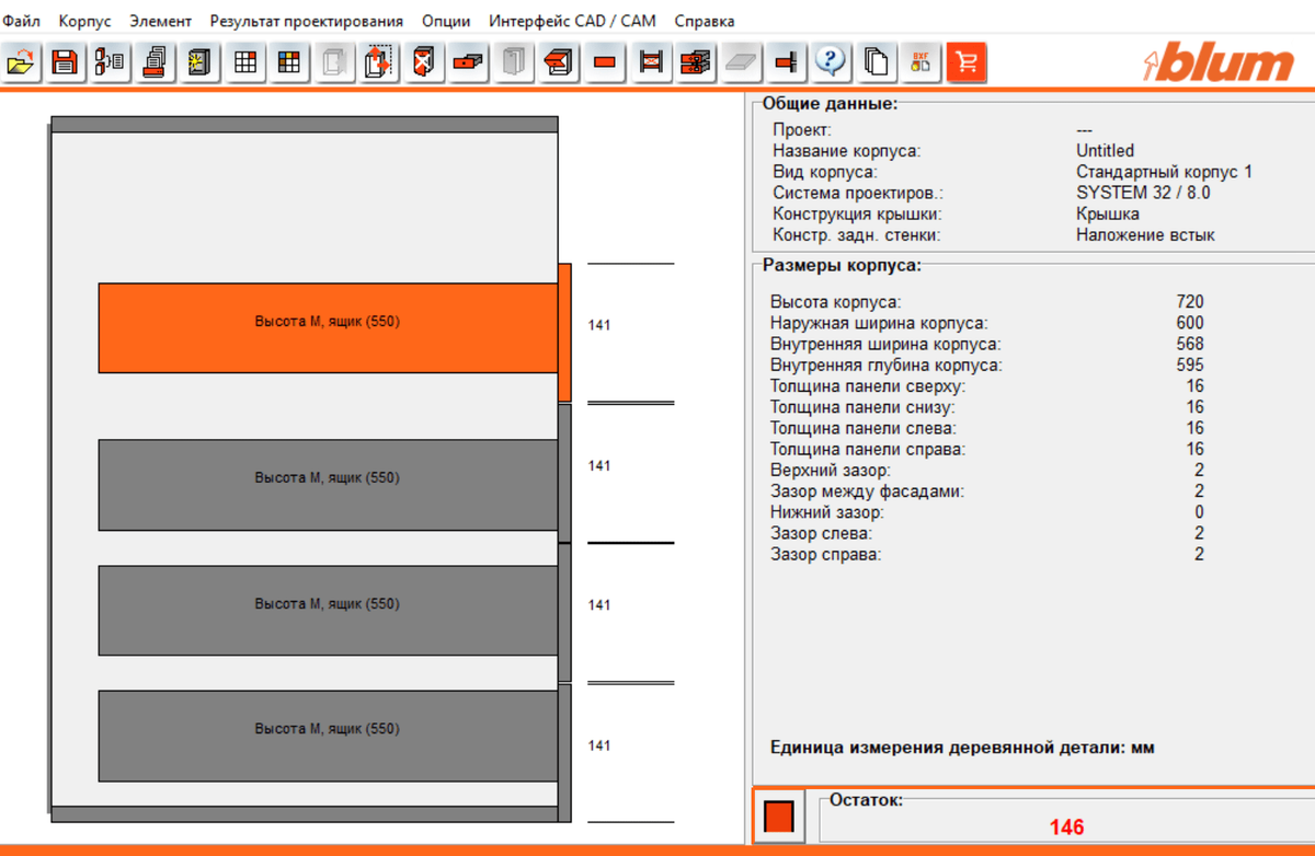 Свой шкаф мы чертили сами, но вполне вероятно, что проще было воспользоваться специальной программой — в интернете их полно. Уже когда все было готово, узнали, что есть удобная бесплатная программа от производителя фурнитуры «Блюм» — «Диналог». Она автоматически рассчитывает размеры деталей для корпусной кухонной мебели, а еще — размечает места, где должны быть отверстия для крепления фурнитуры. Правда, она не расставляет отверстия, которые предназначены для скрепления деталей друг с другом. Поэтому надо либо искать другую программу, которая рисует присадки, либо дорисовывать эти отверстия вручную, либо потом уже досверливать в готовых деталях.