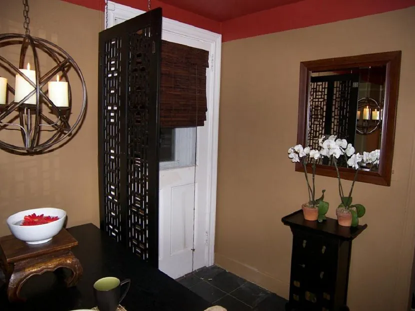 Зная, почему нельзя зеркало напротив входной двери ставить, легко нейтрализовать негативные последствия. Рядом со стеклянной гладью можно поставить живое растение или повесить полупрозрачную занавеску из натуральной ткани или бамбука. В габаритной прихожей проблемный участок скрывают за передвижной ширмой. Над проемом входа рекомендуют прибить колокольчик из латуни или декоративный бумажный фонарик.