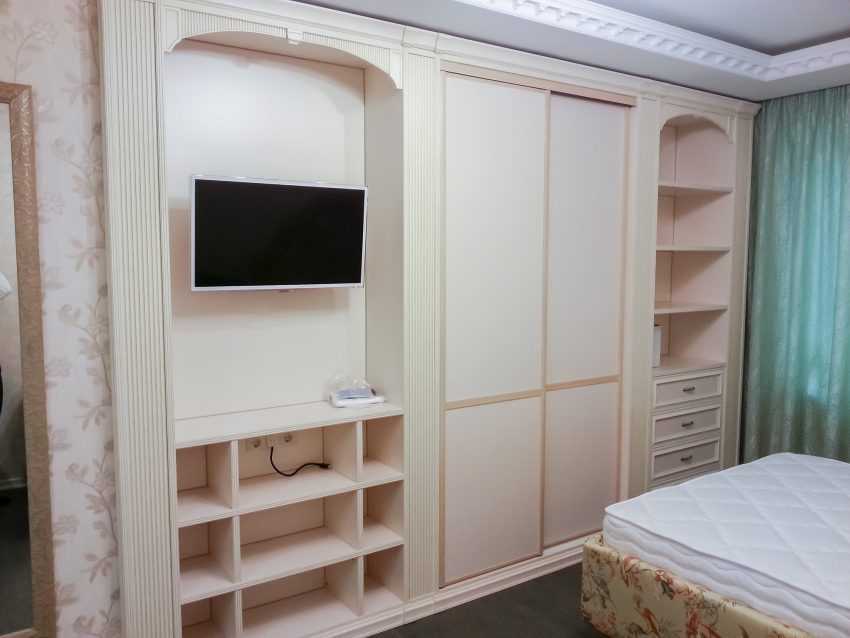 Гипсокартонные конструкции легки в монтаже, надежны, практически ничем не ограничивают фантазию дизайнер и позволяют создать любую конфигурацию надкроватной ниши. Ограничений по эксплуатации таких шкафов немного: по весу содержимого и влажности в помещении.