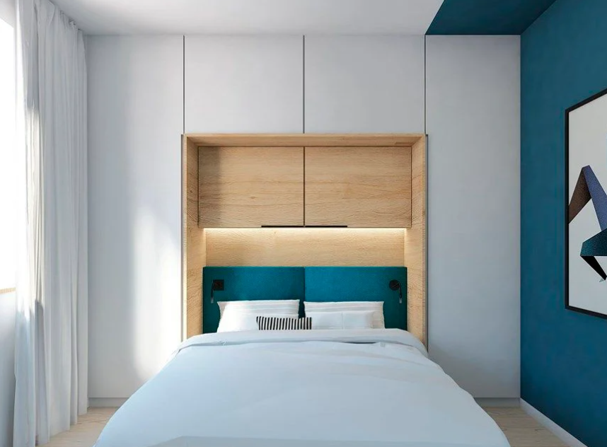 В таком случае вам удастся разместить на столешницах нижних элементов декоративную подсветку или класть перед сном смартфон, книгу и прочие личные вещи. Можно установить по бокам от кровати 2 высоких шкафа, дополненные навесными отсеками