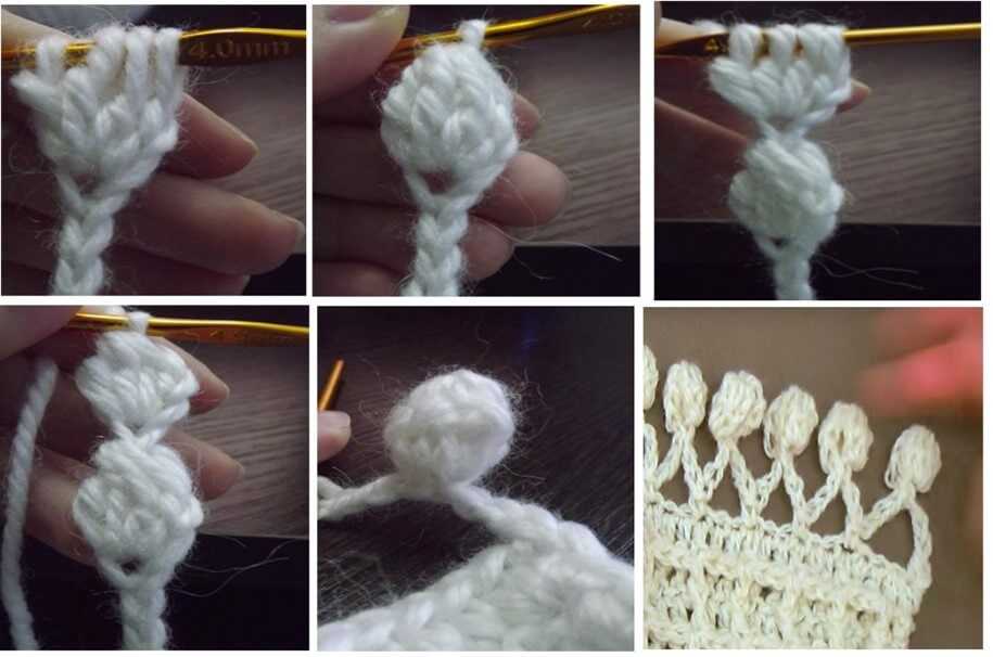 Над 2-й аркой нижнего ряда следует еще провязать 2 СБН, а на 3-й арке – 4 столбика. Далее 2 СБН на 4 арке и снова выполнить цепочку из 4 петель, которая замкнется на середине 3-й арки соединительной петлей. Дальше следует вязать в соответствии с описанием 1-й арки-короны.