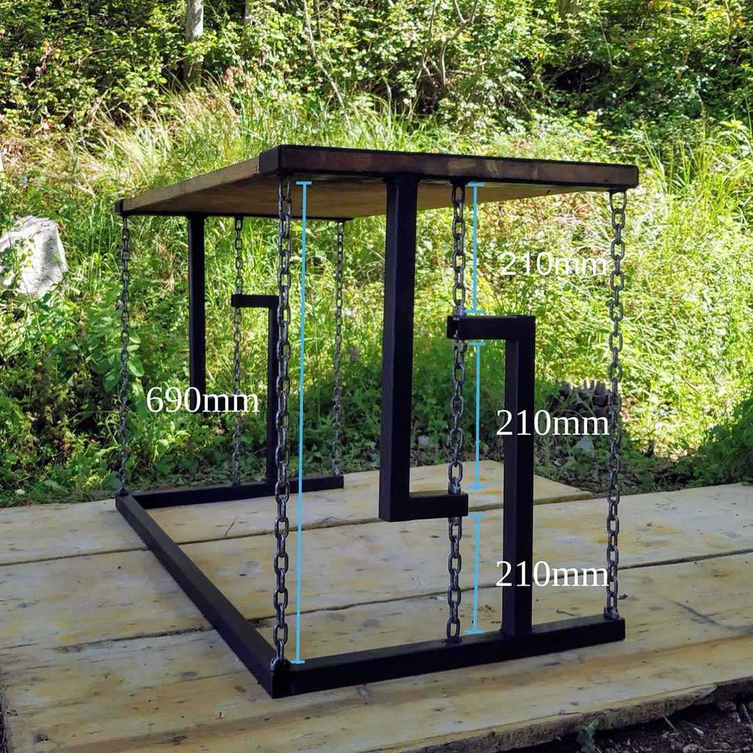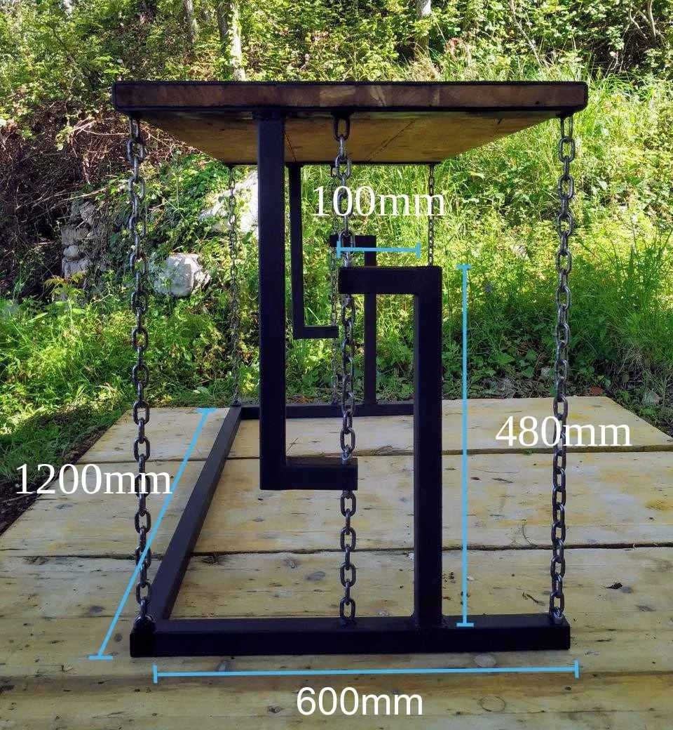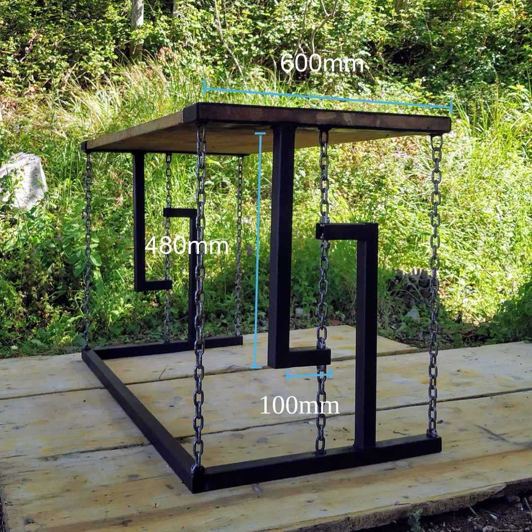 Основа конструкции – уголок 60х60х670 мм, из которого выполнены ножки. Обвязка, в применении к обычному столу именуемая царгой, изготовлена из полосы толщиной 20 мм и шириной 100 мм. Длина двух фрагментов (по длинной стороне) – 1000 мм, двух других (по короткой стороне) – 620 мм. Полосы приварены к уголку снаружи, причем верхний край полосы выше верхнего края уголка на 20 мм.