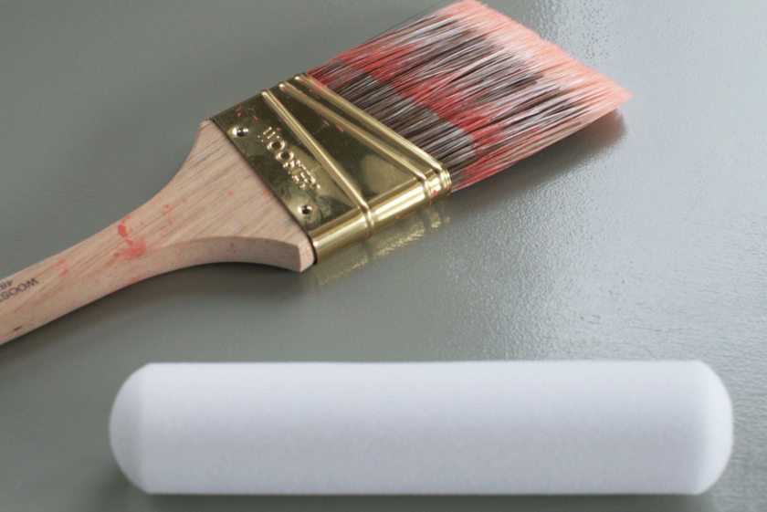 Купите кисти и валик для малярных работ – инструменты должны иметь разную толщину: сподручнее хорошенько прокрасить труднодоступные места. Валик пригодится для окрашивания поверхностей с широкой площадью; кисточки незаменимы в покраске малодоступных мест: углов мебели, съемных деталей фурнитуры и пр.