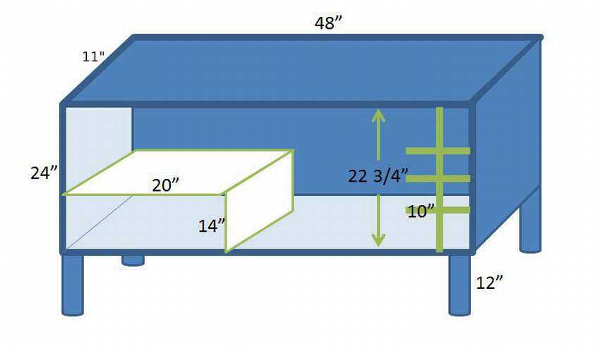 30-ти см стороны выдвижного ящика можно сделать из досок 1×12. На фото ниже показан чертеж с размерами деталей для изготовления ящика и ячеек.