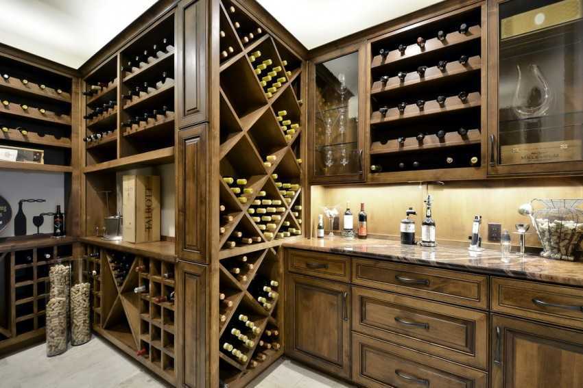 Также есть классические вариации установки шкафов для бутылок вина в виде отдельного предмета интерьера. Рядом может находиться холодильник. Набирает популярность вариант размещения углового винного шкафа таким образом, чтобы сэкономить пространство.