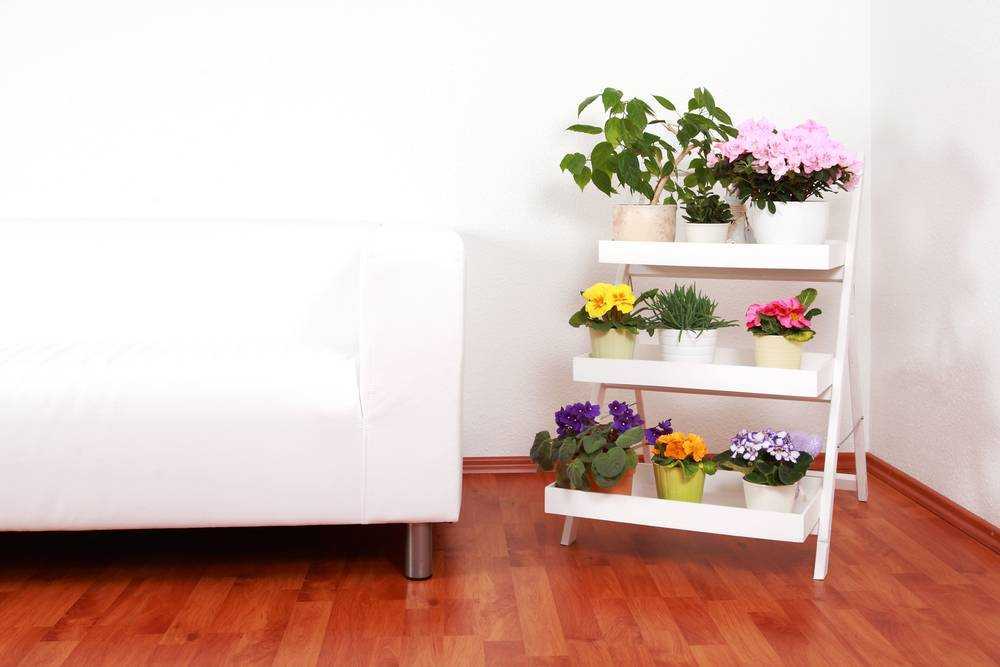 Если в планах есть полка под цветы с несколькими ярусами, тогда на ней можно разместить только те цветы, которые смогут уживаться друг с другом. Они не должны перекрывать доступ света и питательных веществ. Правильный выбор высоты также очень важен. Полки в несколько ярусов можно монтировать до самого потолка, но, если требуется поставить только один цветок, тогда высота подставки не должна быть больше половины высоты до потолка. Это не запрет, но визуально комната будет казаться меньше, чем есть на самом деле в силу смещения акцента. Напольные полки для цветов должны иметь различные по размерам полки. При этом будет возможность на низ поставить растения с большим объемом, а наверх поднять компактные горшки.