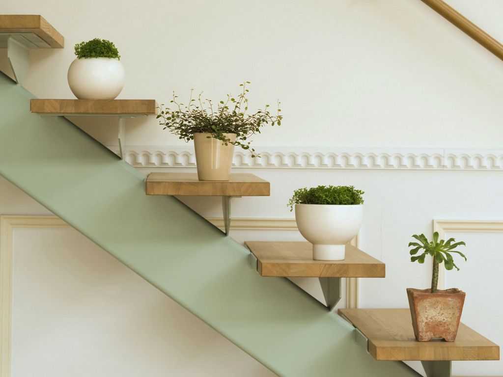 Подставки для цветов должны прочно крепиться на стену. Разместить растения можно и в подвесных кашпо с цельным дном, которое не допустит протекания воды при поливе.