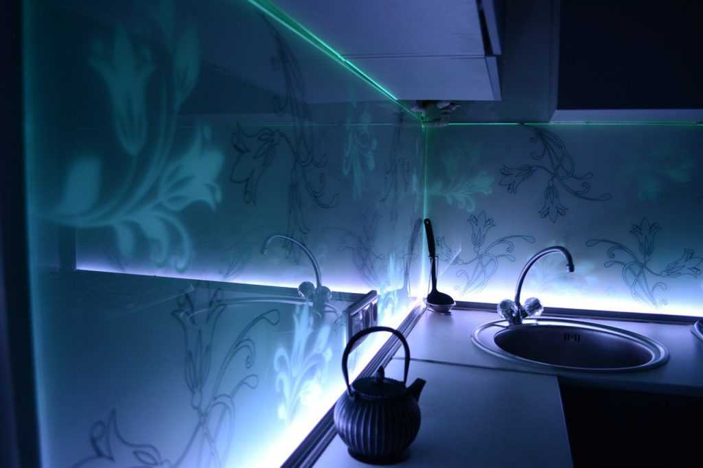 Чтобы соорудить подсветку для полок, изготовленных из стекла, нередко используется специальный анодированный алюминиевый профиль. Толщина этого профиля, в который вставляется стекло, составляет 8 мм. Так, свет будет «течь» сквозь стекло, отражаясь от краев поверхности. При этом сама лента остается незаметной. Преимущество такой методики в том, что светодиодная лента не излучает УФ, поэтому ее можно использовать в качестве альтернативы или дополнения к основному освещению жилища. Кроме лент также можно использовать точечную подсветку, которая значительно проще, а для сложных вариантов можно применить модульную светодиодную подсветку.