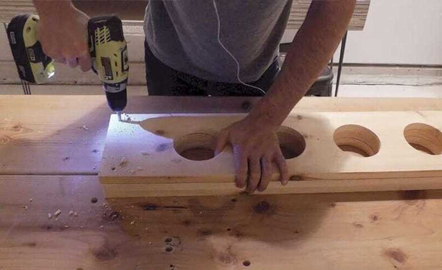 На них следует отметить 2 точки с расстоянием 5 см от края. В отмеченных точках необходимо просверлить отверстия для саморезов. Со второй заготовкой необходимо проделать те же манипуляции.