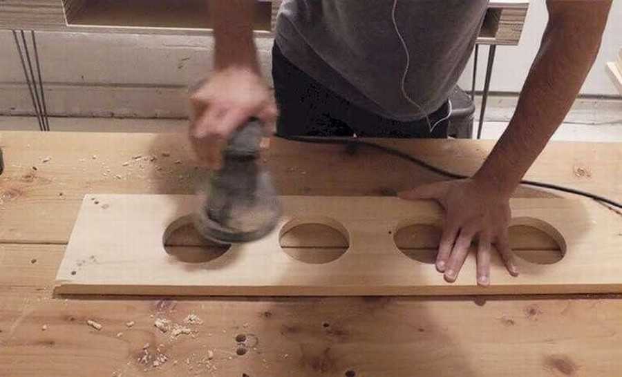 В досках для полок сверлятся отверстия под размер горшков и для крепления веревки:
