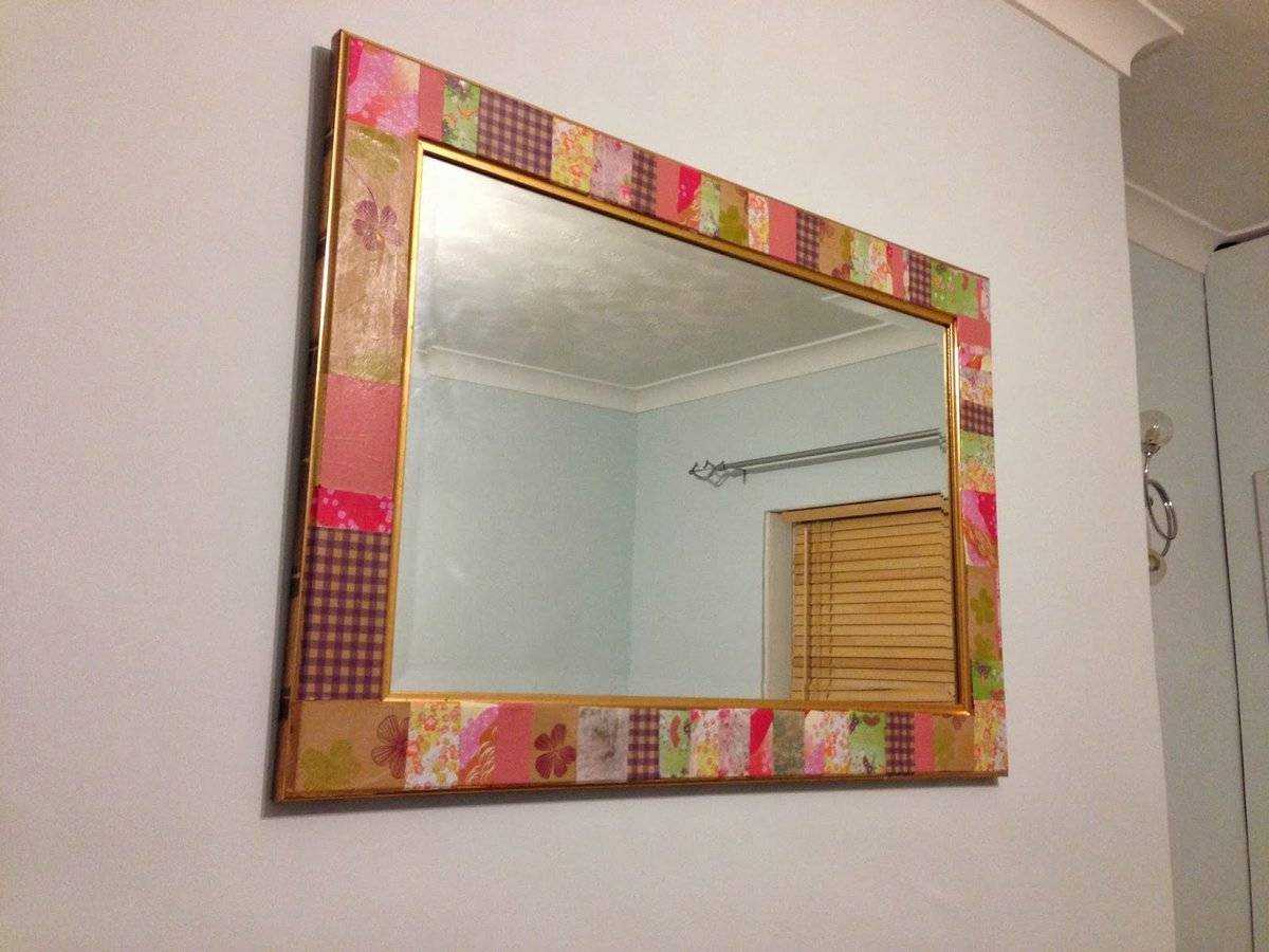 - декор за границами зеркала – из картона, ДВП, фанеры вырезают основу нужной формы, которая должна выбираться больше самого предмета декорирования. Декоративные элементы наклеиваются по краю, основание просушивается, потом на него монтируется зеркало, как будто вставляется в раму;
