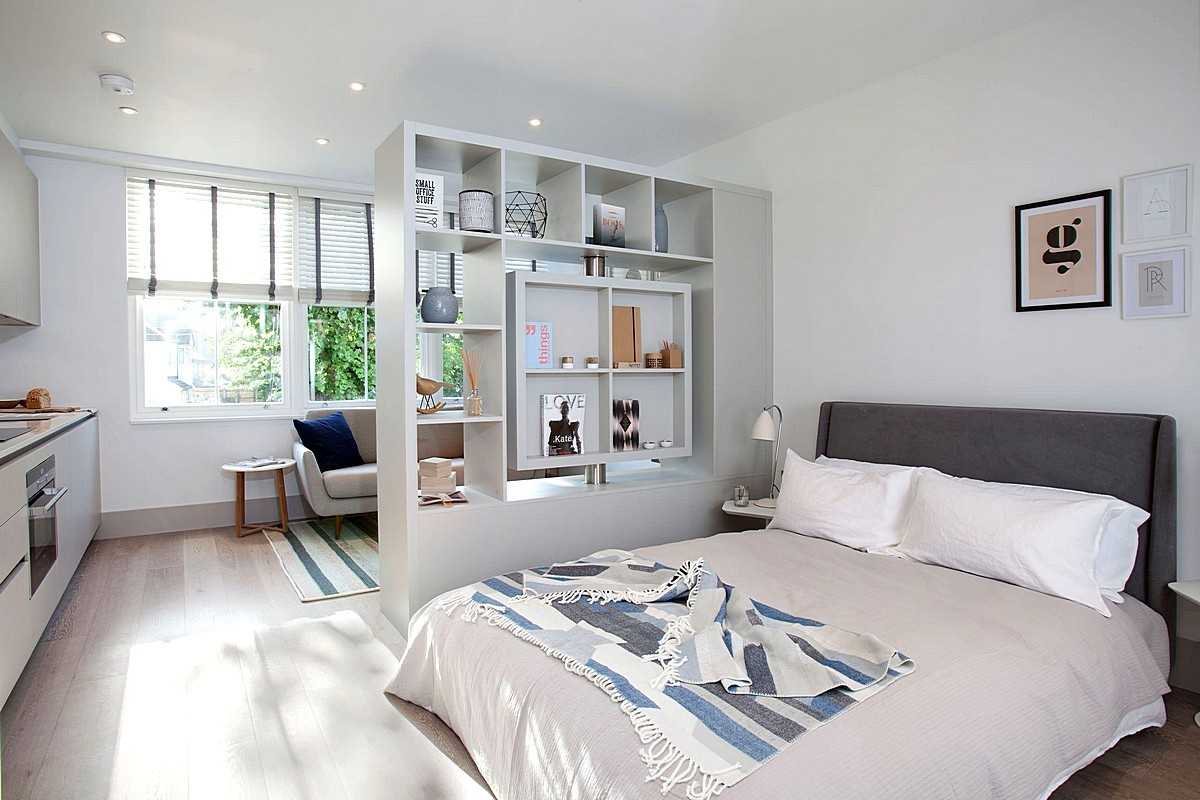 Если в квартире проживает только один человек, то вполне достаточно поделить ее на две части с помощью книжных полок или дивана: рабочую и для сна.