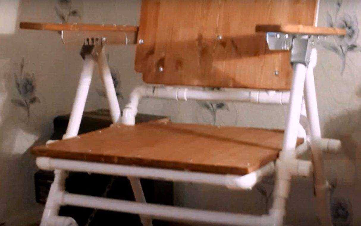 Чтобы собрать складной стул, потребуется полипропиленовая труба диаметром 25 мм, фитинги, материал для сиденья, нитки, 2 болта, 2 гайки. Руководство, как сделать складной стул: