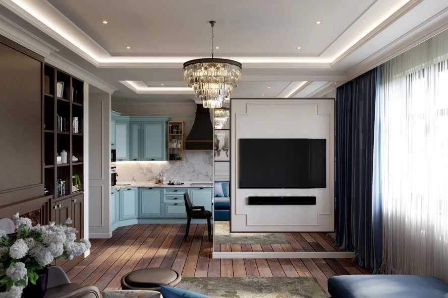 При помощи использования шкафов-перегородок с зеркальной дверью, есть возможность визуально расширить пространство, а наличие правильной подсветки поможет расставить акценты на функциональных особенностях каждой зоны.