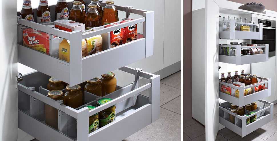 Полное выдвижение ящиков. Дверцы напольных шкафов красиво выглядят и могут быть очень удобными, если продумать наполнение кухни, но при открывании они занимают полезное пространство и иногда мешают. Проблема решается очень просто: вместо полок с дверцами тумбы оборудуют ящиками. Установив фурнитуру для полного выдвижения, можно получить полноценный доступ к каждой мелочи, хранящейся в шкафчике.
