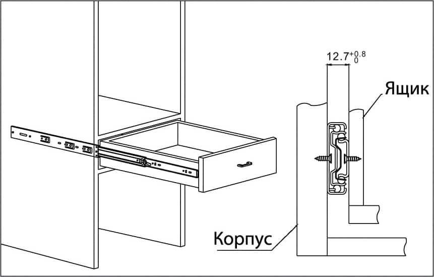 - Глубина — не менее 0,46 м (если ящики съемные, для ящика требуется 45 см, а 1 см служит свободным пространством на стенке модуля, расположенной сзади), в среднем общие размеры 56-58 см;
