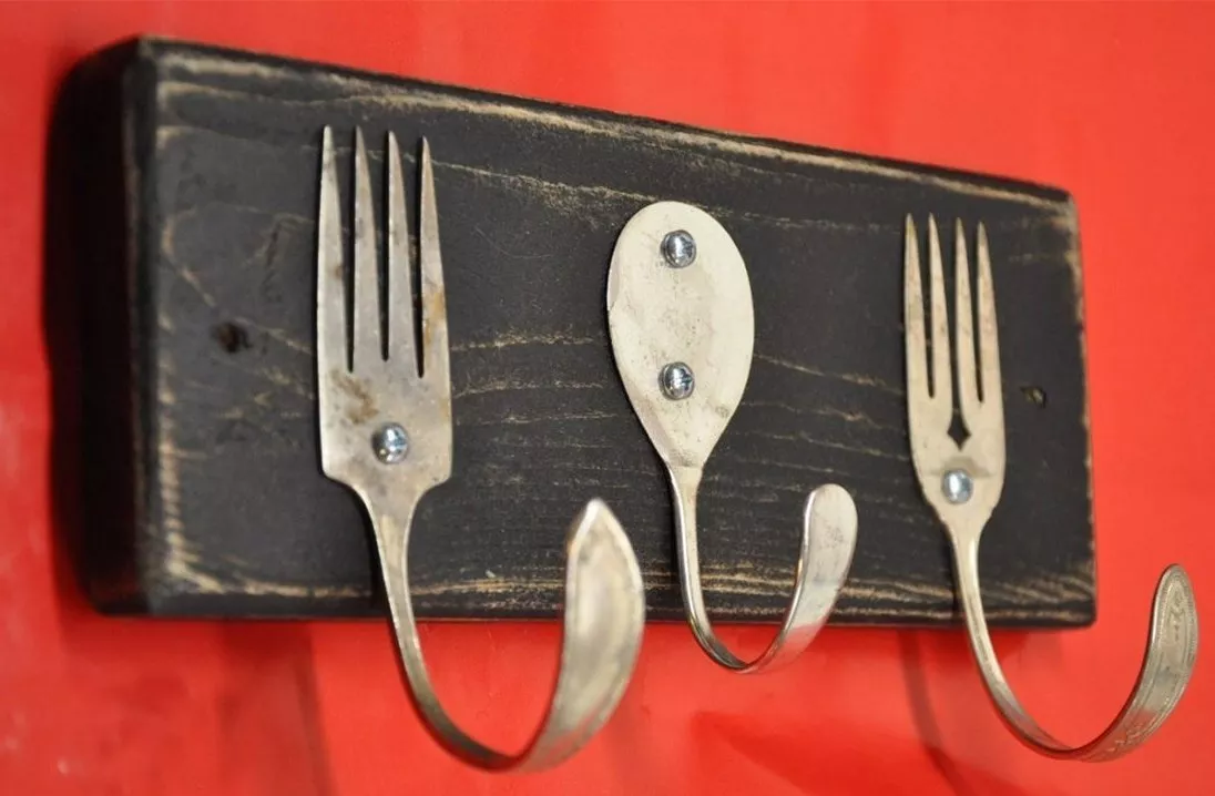 Оригинально будет смотреться вешалка с крючками из ложек и вилок. Для этого их достаточно согнуть и закрепить к дощечке.