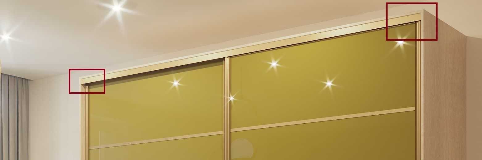 Верхняя направляющая Premial устанавливается заподлицо с торцом крыши и боковых стоек шкафа-купе. В случае, если крышка выходит за предела корпуса шкафа-купе, например, содержит споты или светодиодные ленты для подсветки, или выступает в качестве декоративного карниза, то верхний трек ставится заподлицо только с боковыми стойками.