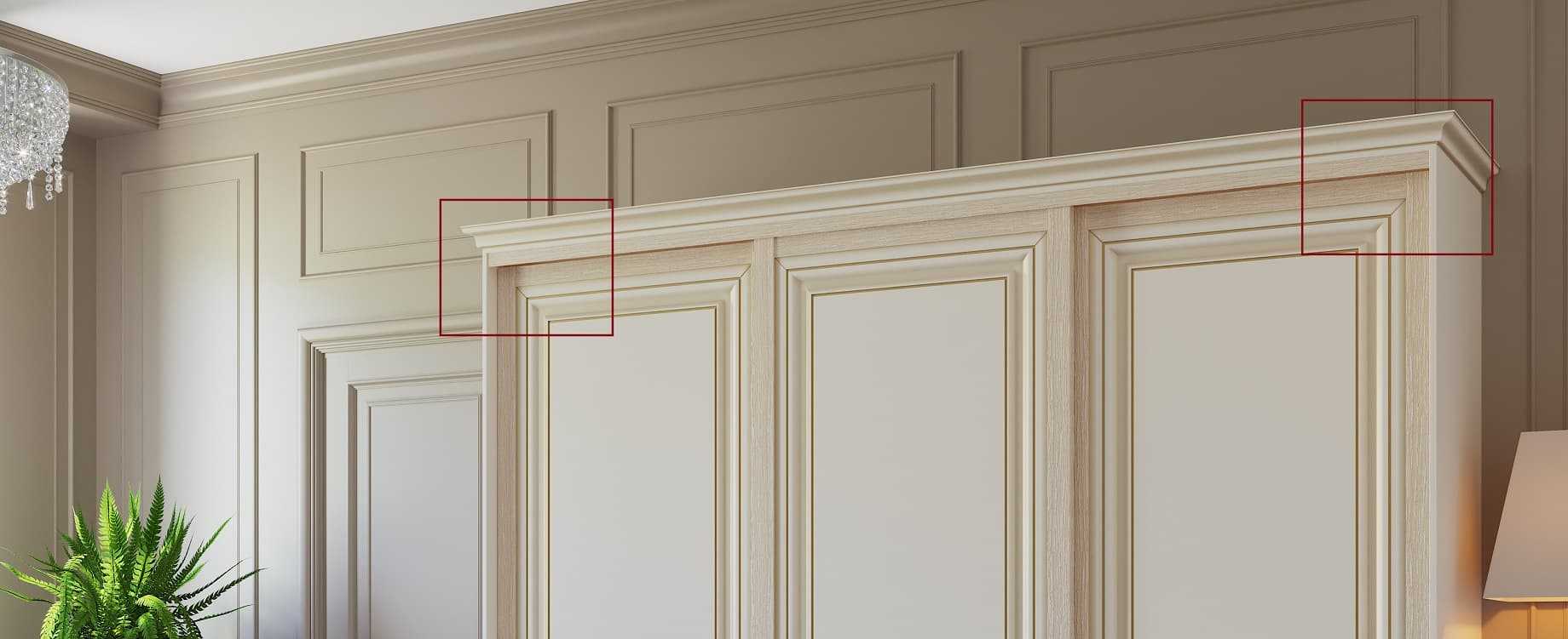 Как видите, верхний трек достаточно выделяется на общем фасаде шкафа-купе, выступая частью его дизайна. Но при правильной установке и подобранному декору даже в неоклассической модели шкафа-купе (с широким профилем П) верхний трек не выступает чужеродным элементом: