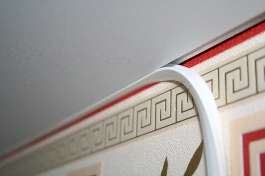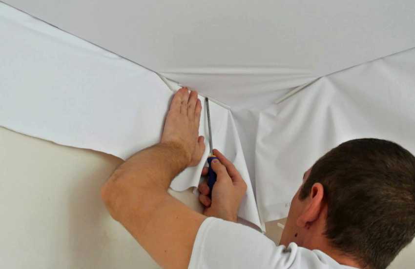 - Ненужные остатки полотна аккуратно обрезаются, а стыки между стенами и потолком закрываются поливинилхлоридной гибкой накладкой, играющей ту же роль, что и плинтусы на полу.