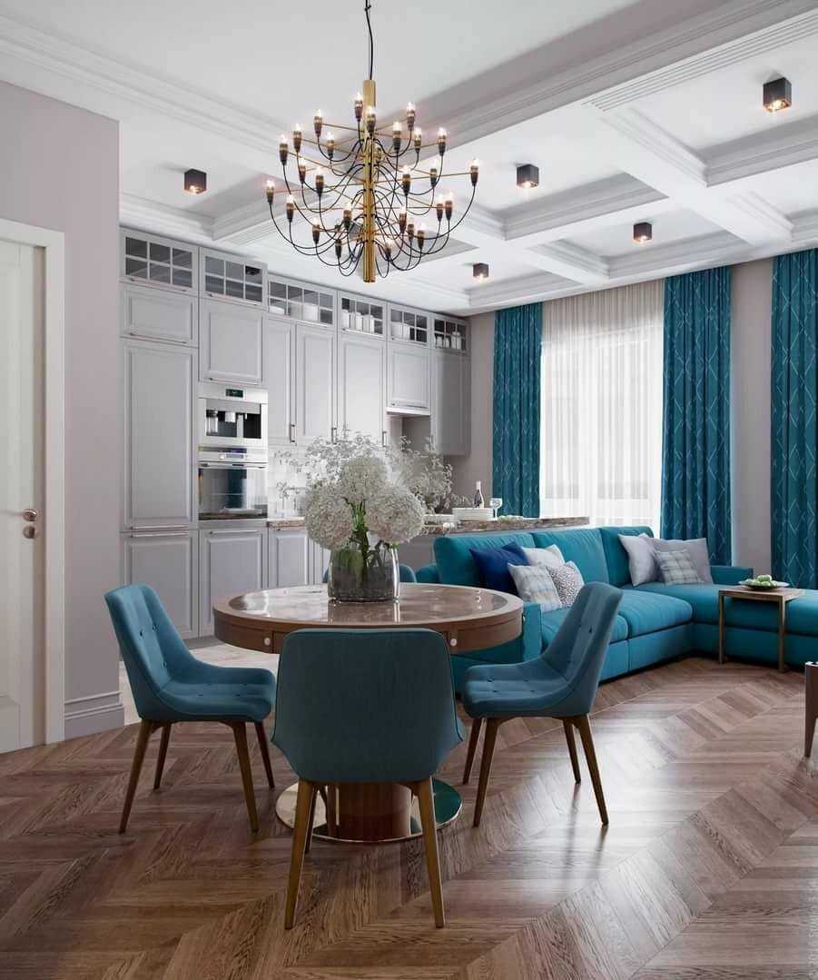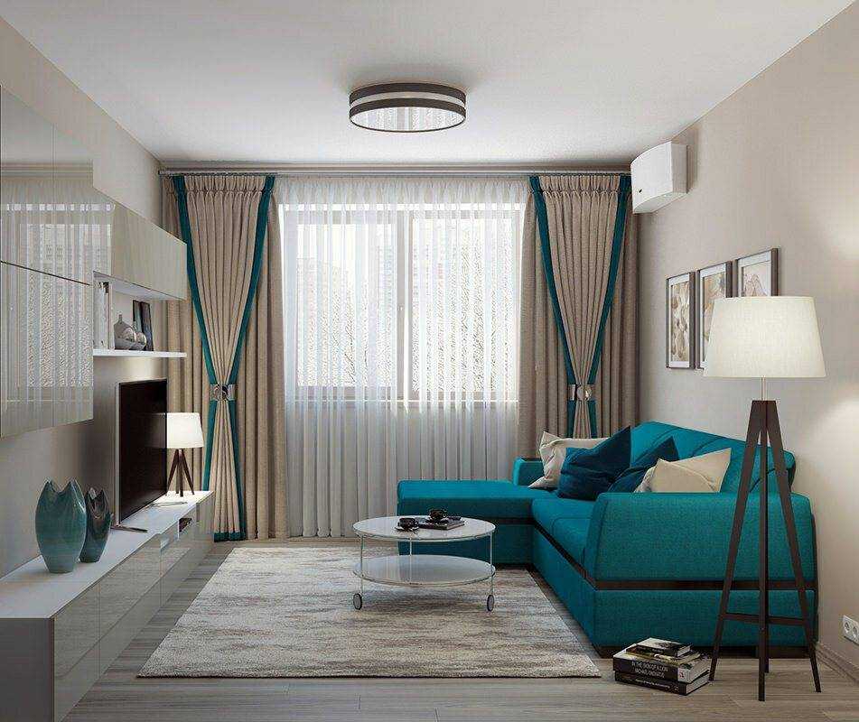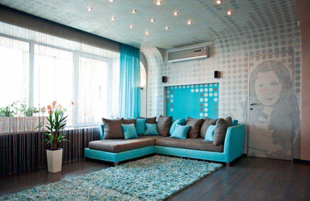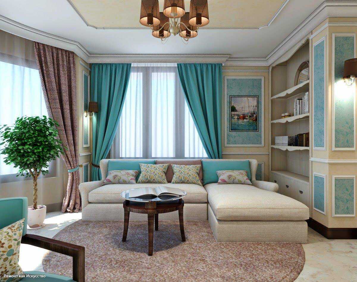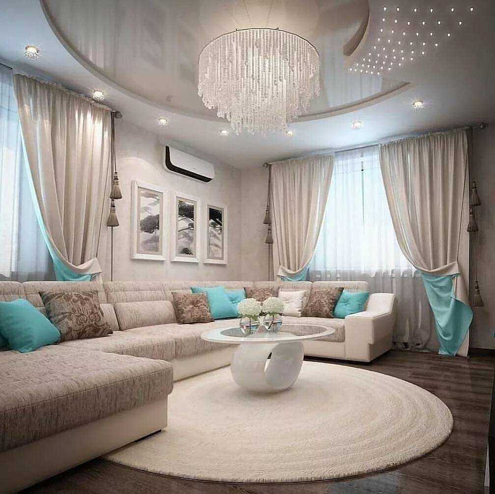 сочетание бирюзовых штор, мебели и потолка в гостинной