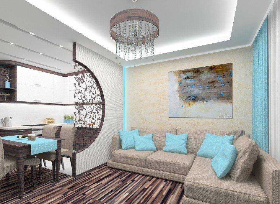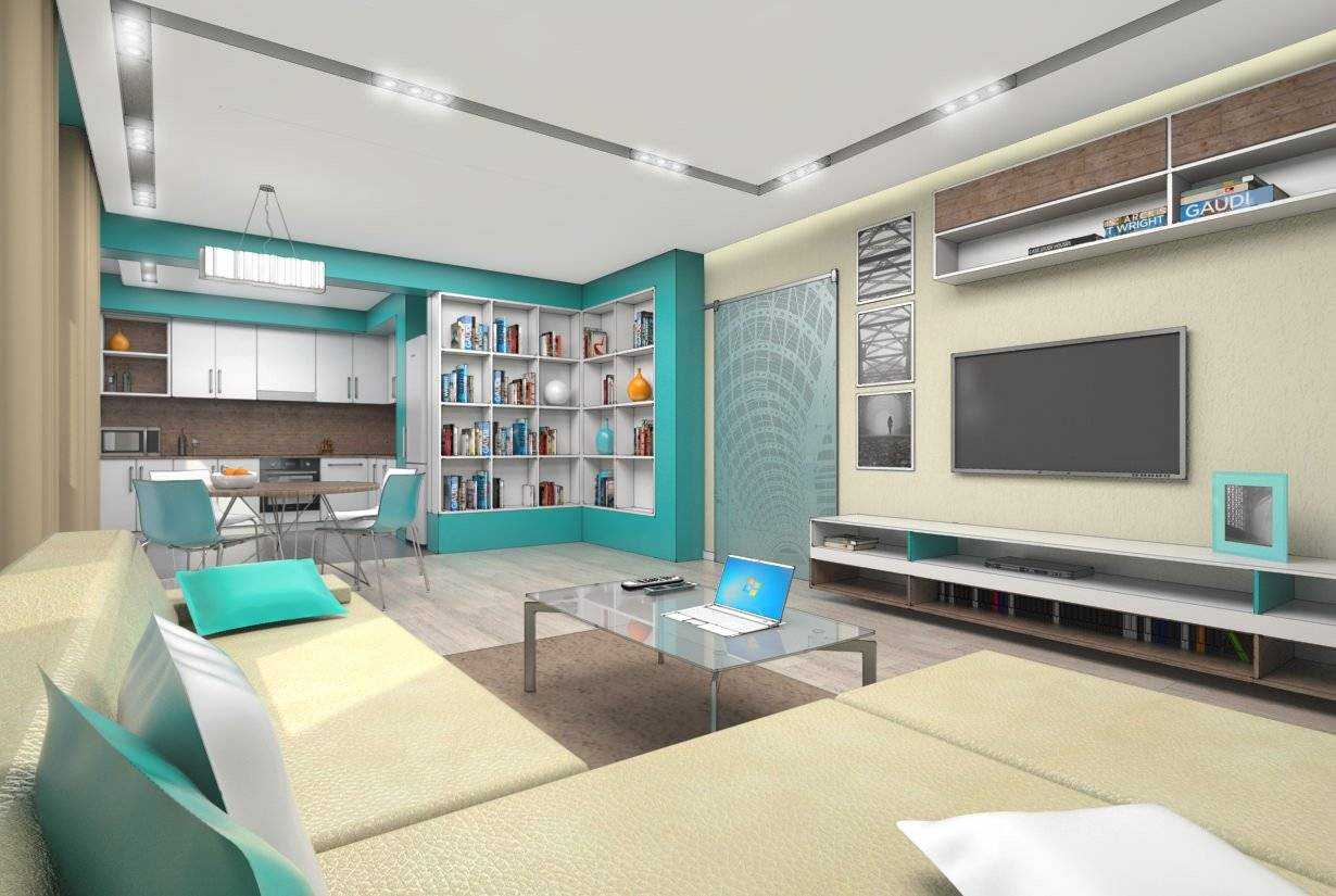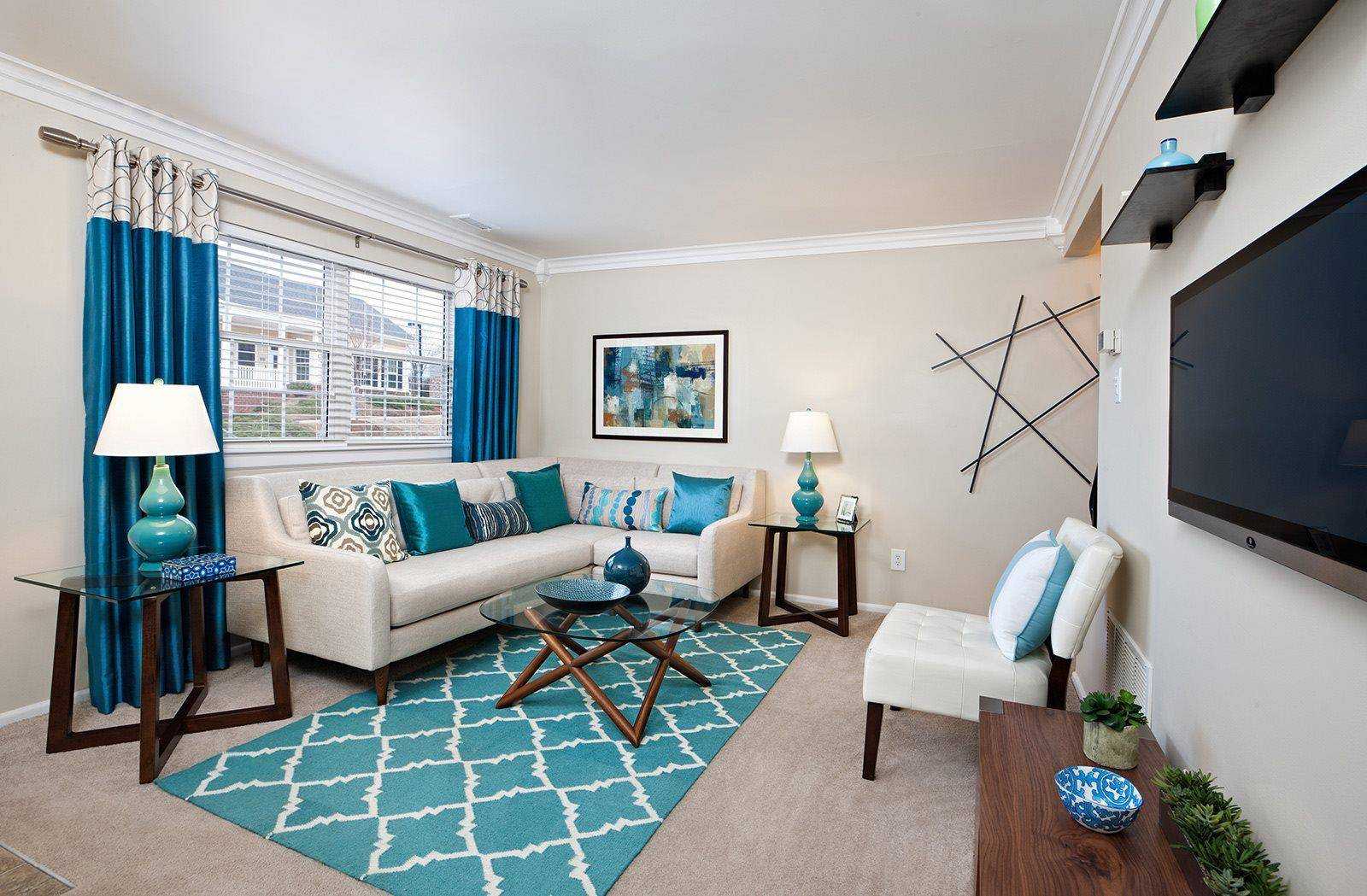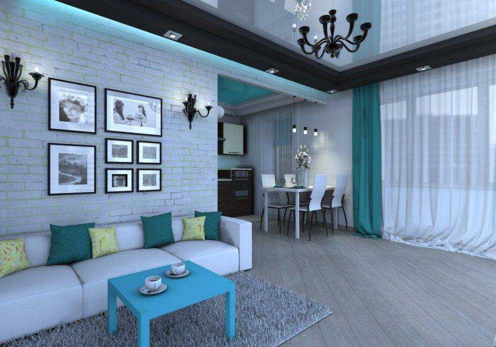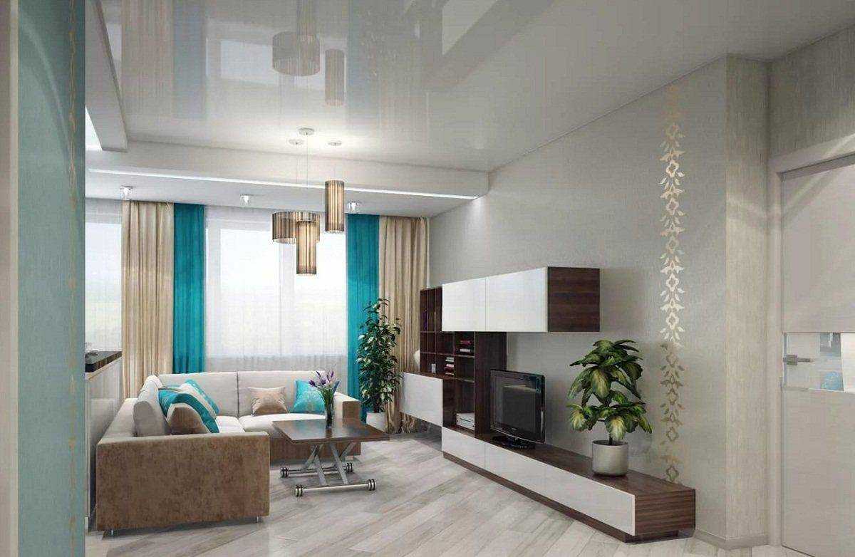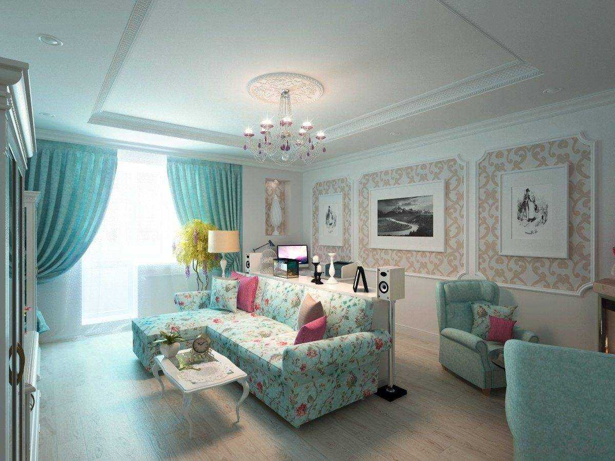сочетание бирюзовых штор, мебели и потолка в гостинной