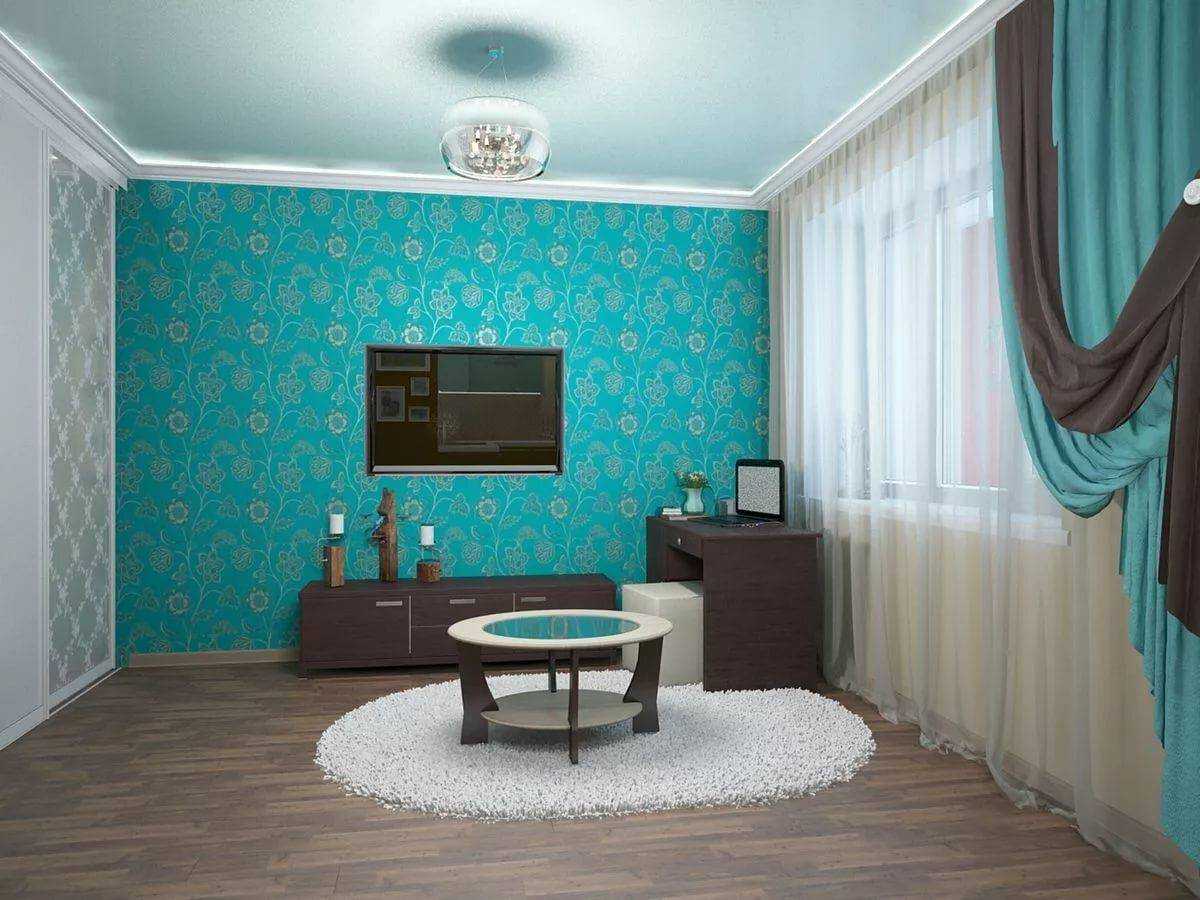 Бирюзовые обои идеально сочетаются со многими оттенками, что позволяет получать изысканные комбинации. Шторы при этом могут быть выполнены из плотной или воздушной ткани. Грамотное сочетание цветов корректирует помещение, создавая в нем нужную атмосферу, поэтому к выбору занавесок следует относиться со всей ответственностью, так как с их помощью можно совершенно по-новому распределить акценты. Теплая цветовая палитра создаст эффект приближения и увеличения проема, а холодная, наоборот, удаляет объект.