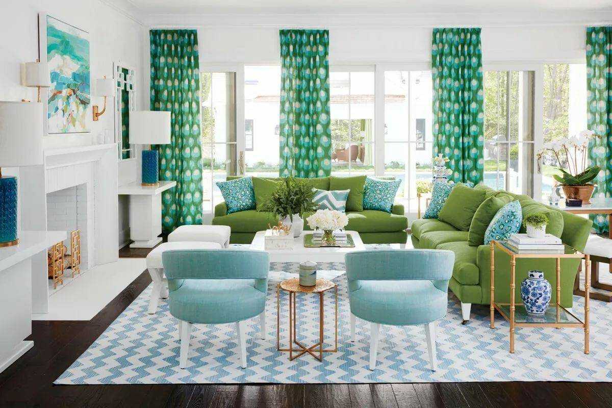 Шторы и прочие аксессуары в гостиную бирюзового цвета
