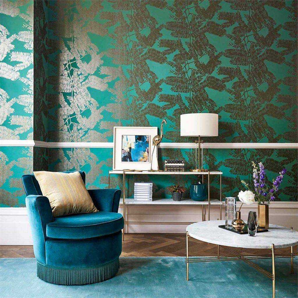 Эффектного интерьера в помещении с бирюзовыми обоями легко добиться при умелом комбинировании с оттенками мебели, аксессуарами и текстилем. Для создания теплой атмосферы лучше использовать натуральную деревянную мебель. Это насытит комнату энергией, и расширит пространство. Для классического оформления подойдут акценты из позолоты.