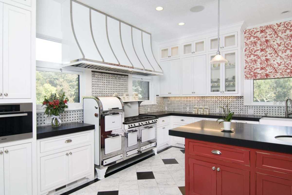 При выборе цвета шкафчиков лучше обратить внимание на различные оттенки основного цвета или же сделать выбор в пользу черно-белого гарнитура. Иначе получится чересчур яркая и неуютная кухня
