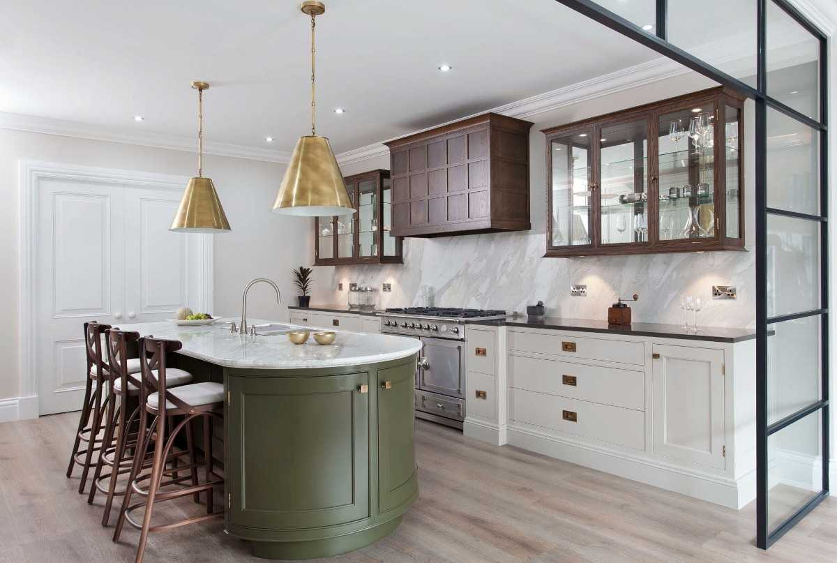 Зеленый. Насыщенный зеленый будет тяжело смотреться в качестве доминирующего фона, но более светлые его оттенки удачно гармонируют с белыми фасадами мебели, с молочными, кремовыми или светло-серыми элементами декора.