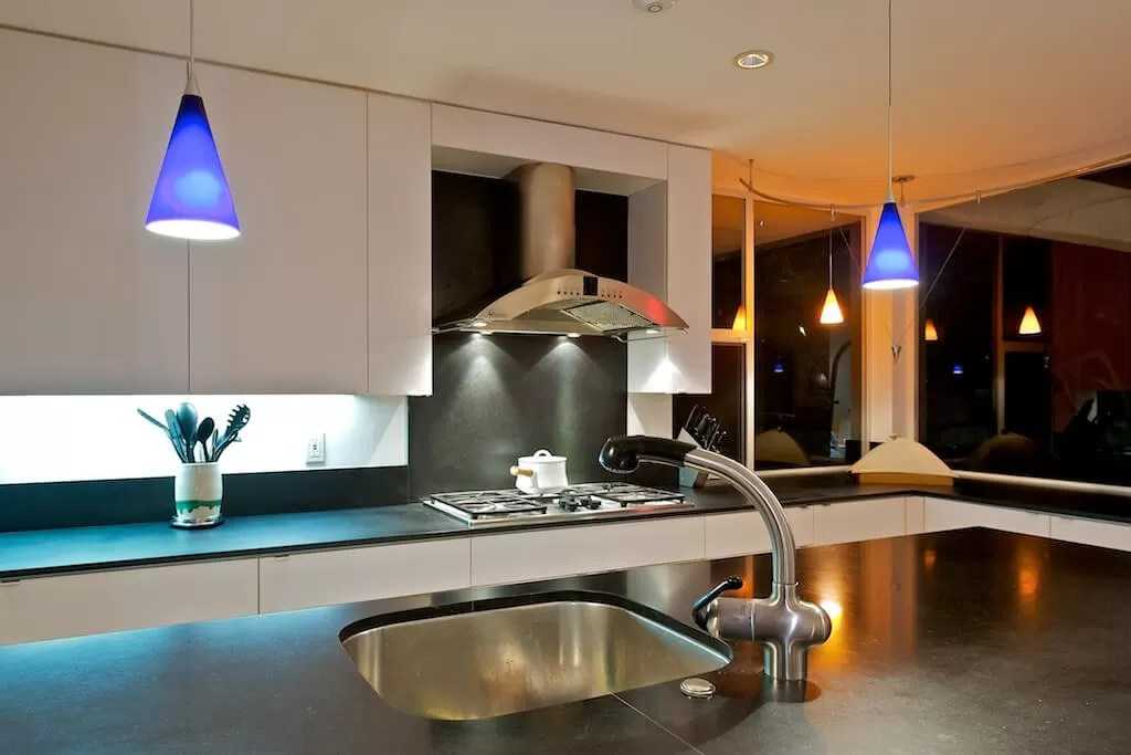 Источников света в обязательном порядке делается несколько – как минимум по одному для каждой логической зоны помещения. В современных кухнях, кроме центральной потолочной люстры, необходимо разместить еще несколько локальных. Рабочая зона освещается максимально ярко при помощи точечных светильников, спотов, ламп на специальной рельсе, которые легко переместить практически в любое место. Часто источники света монтируются на нижнюю часть подвесных шкафчиков. Желательно оформлять подсветку рабочего места лампами с холодным естественным световым потоком, который не искажает цвет приготавливаемых блюд.