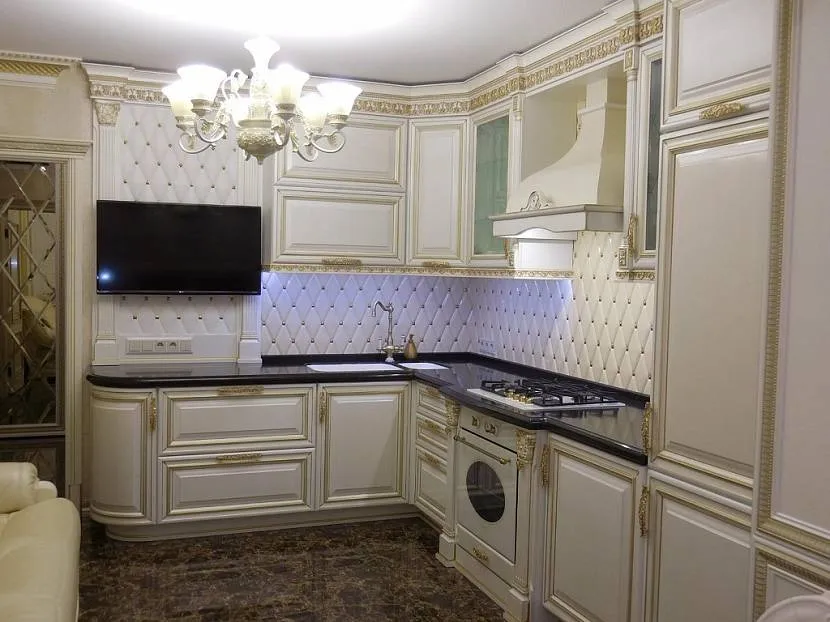 В стиле классика применяют натуральные материалы, такие как, мрамор, дерево и камень. Пол в основном выкладывают паркетом или плиткой с четким рисунком. На потолочной плоскости присутствует декоративная лепнина. В помещении выполняется линейная или угловая планировка с симметричным расположением мебели и техники.
