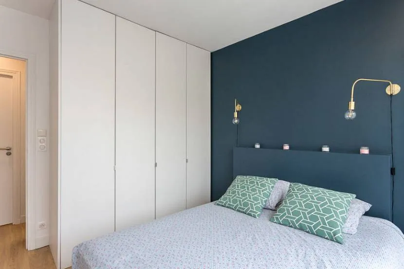 Один из приемов для узкой комнаты – акцентная отделка стены в изголовье, переходящая на потолок. Это позволяет привести вытянутое помещение к пропорциональным размерам.
