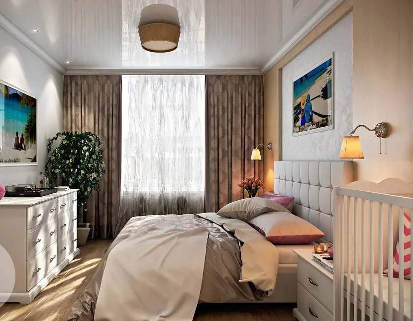 Функциональность спальни должна оставаться на прежнем уровне. Она должна отвечать требованиям взрослых членов семьи. Задача при установке детской кроватки заключается в выборе способа зонирования помещения – с помощью занавески, ширмы или декоративной перегородки. Это делается для того, чтобы ребенка ничто не отвлекало от сна.