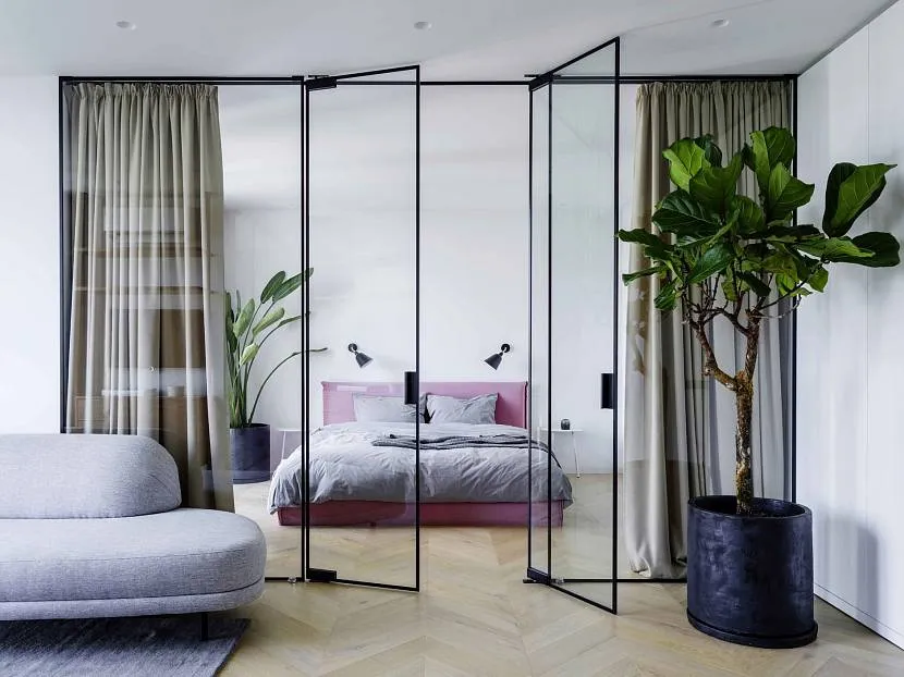 Стеклянный переход к спальне в квартире-студииИсточник www.elledecoration.ru