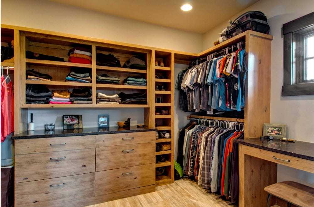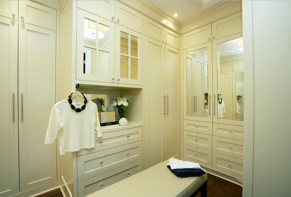 Главным плюсом угловой конструкции является удобство размещения вещей. Шкаф-купе или гардеробный шкаф занимает много пространства, но при этом он недостаточно вместительный. Закрытая угловая комната служит не только хранилищем для одежды, но и примерочной. Также удобно подбирать одежду по стилю – все элементы гардероба на виду и можно сразу оценить их сочетание.