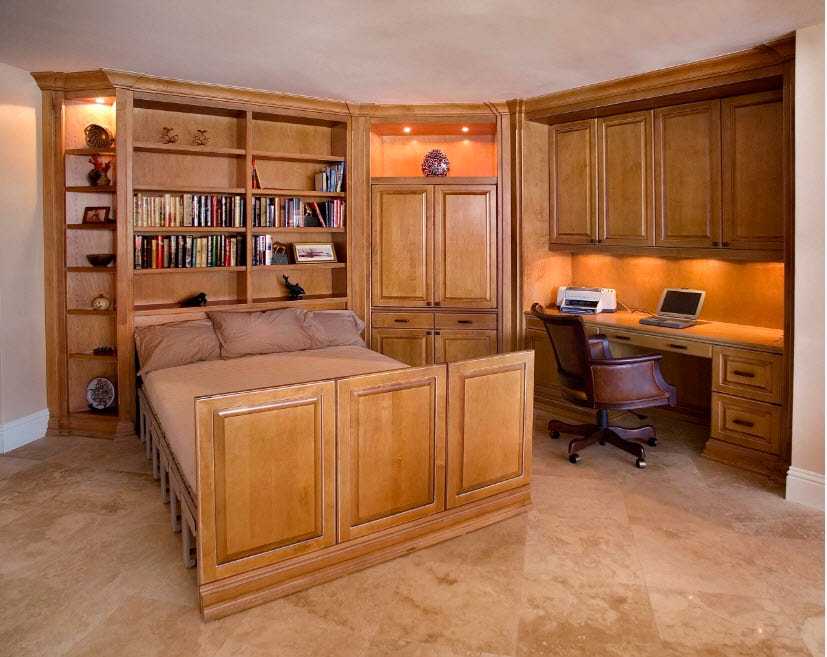 Такой кабинет станет настоящей изюминкой гостиной, привлекая внимание гостей своим внешним видом и дизайном, который будут выбирать дизайнеры или домовладельцы. Для визуального расширения помещения или придания большей освещенности самому шкафу на стадии проектирования могут быть применены некоторые простые техники