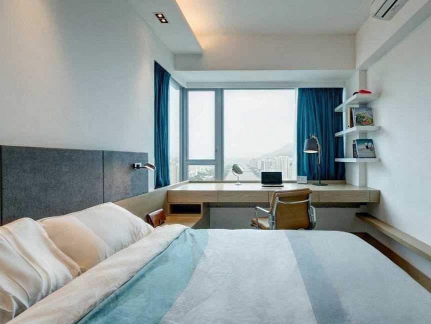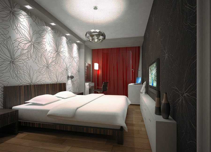 С организацией спален дело обстоит несколько проще. При ширине более 2,5 метров двуспальная кровать вмещается без труда. Расположить ее лучше в самой глубине помещения. Если там окно, можно отступить несколько сантиметров, чтобы было легко пользоваться занавесками. При внушительной длине прикроватные тумбы без труда впишутся по обе стороны от кровати. В противном случае придется обойтись одной или вовсе без них.