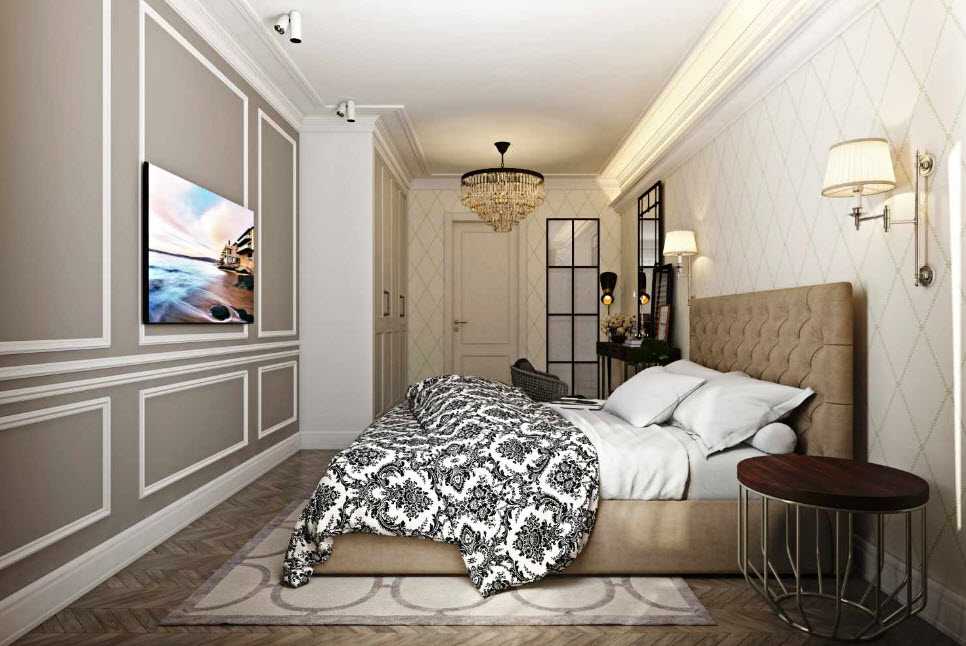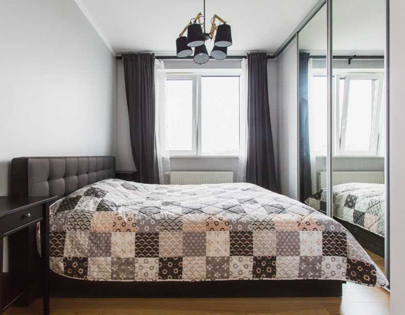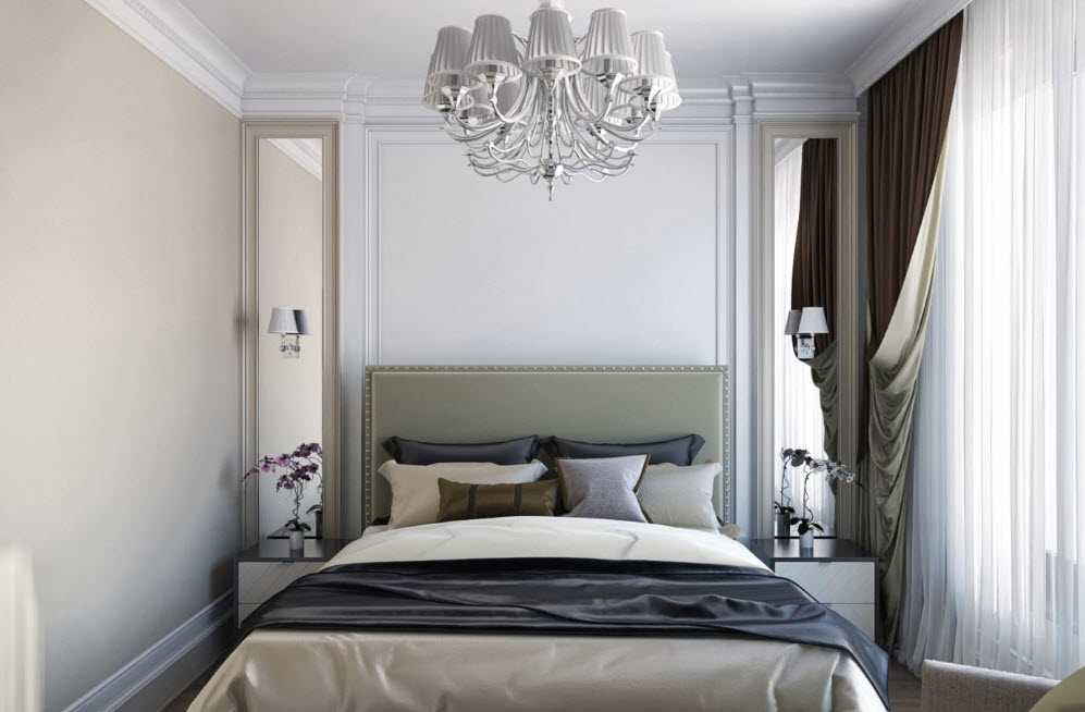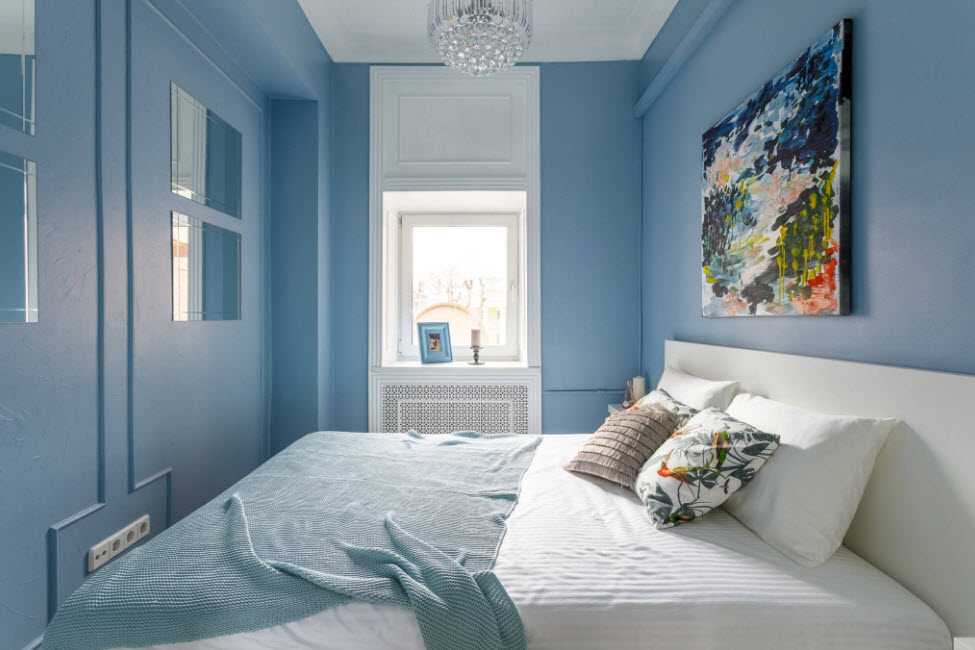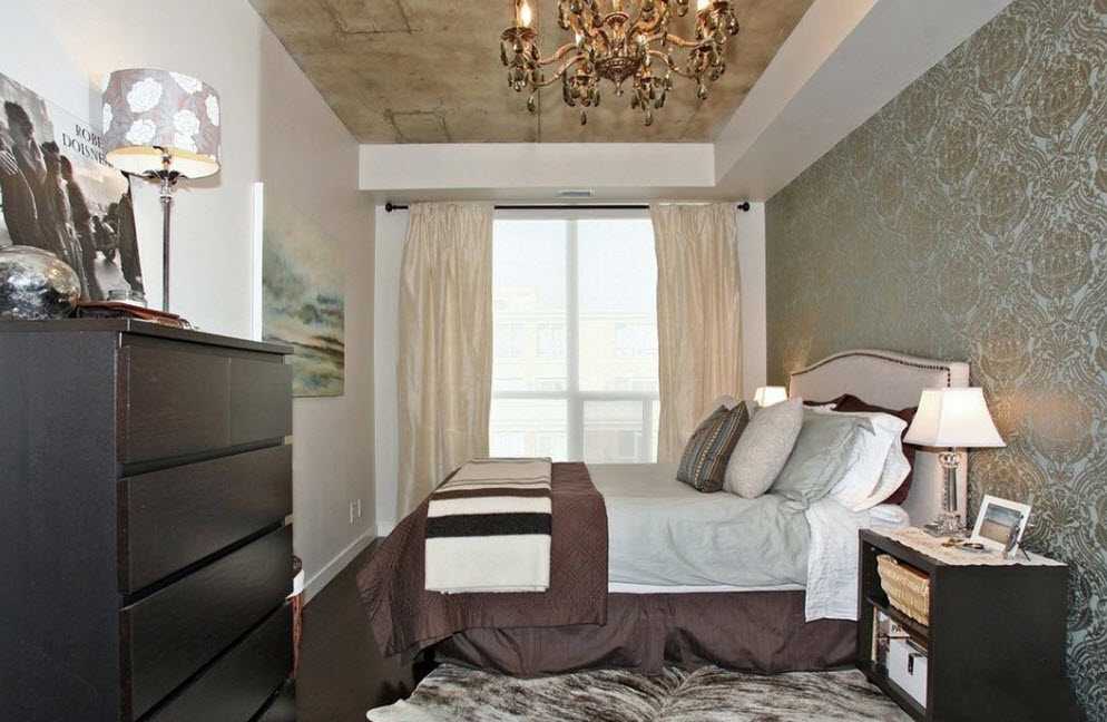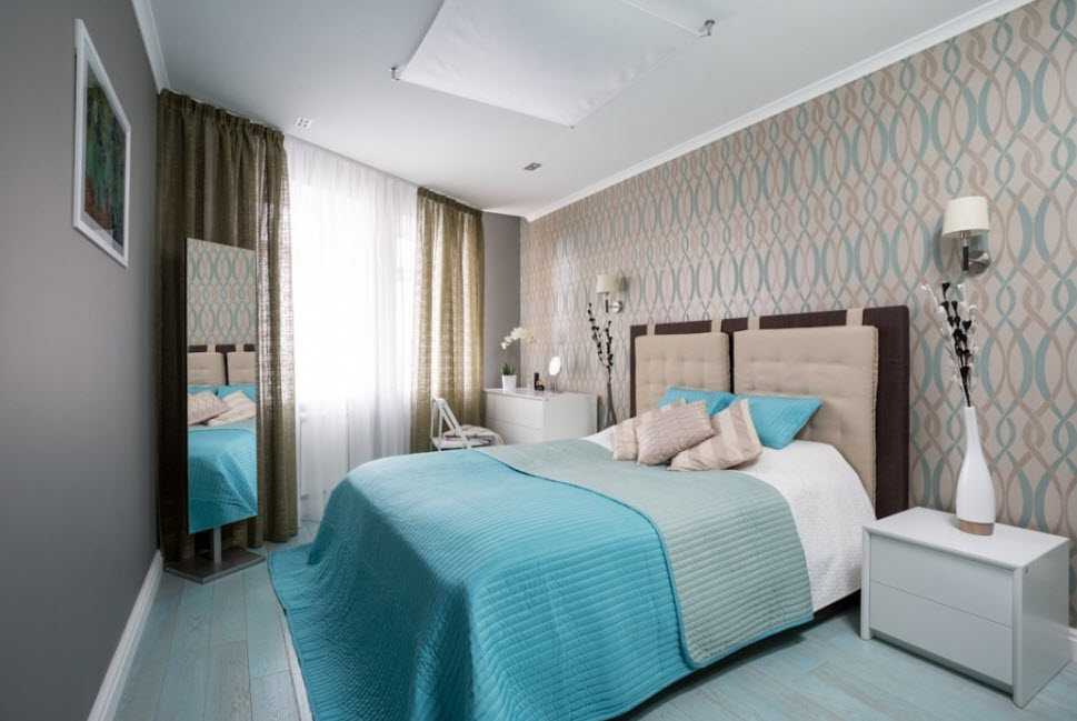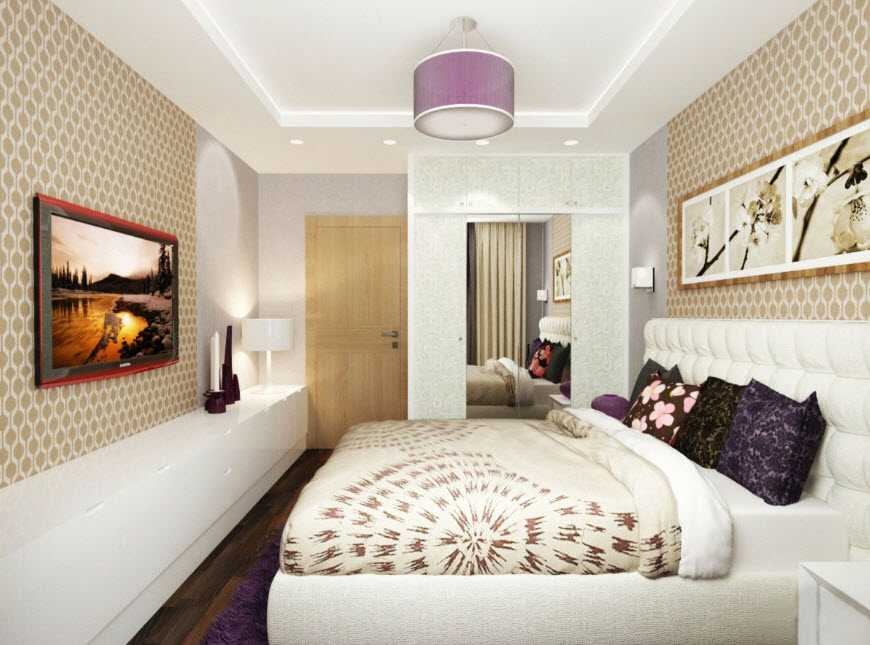 В случае, когда спальня получается совсем маленькой, попытайтесь расширить торцевую стену с изголовьем декораторскими приемами: например: оформить ее зеркалами или обоями с оптическим эффектом.