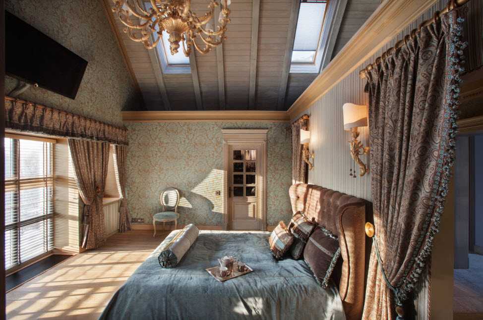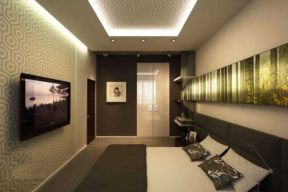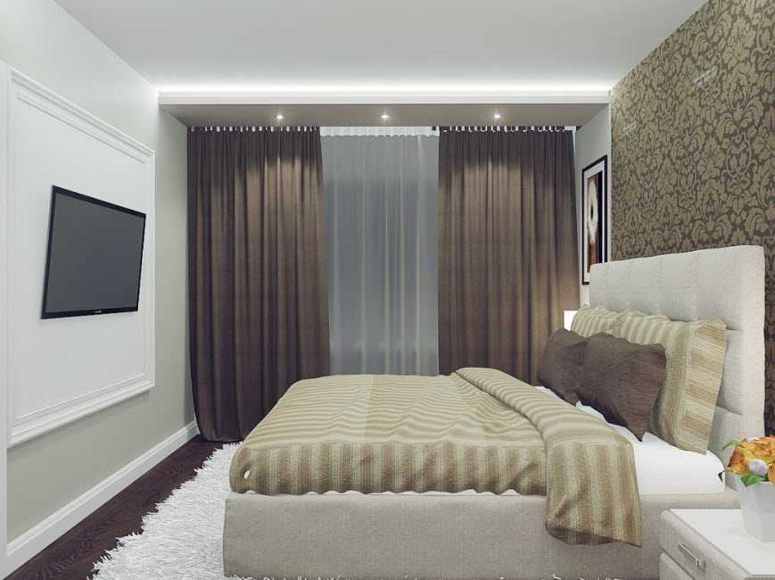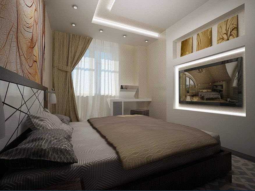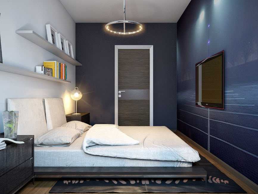 Телевизор размещают напротив кровати под потолок. В другом конце комнаты хорошо поставить столик с небольшим креслом и настольной лампой. Уюта сразу прибавится.