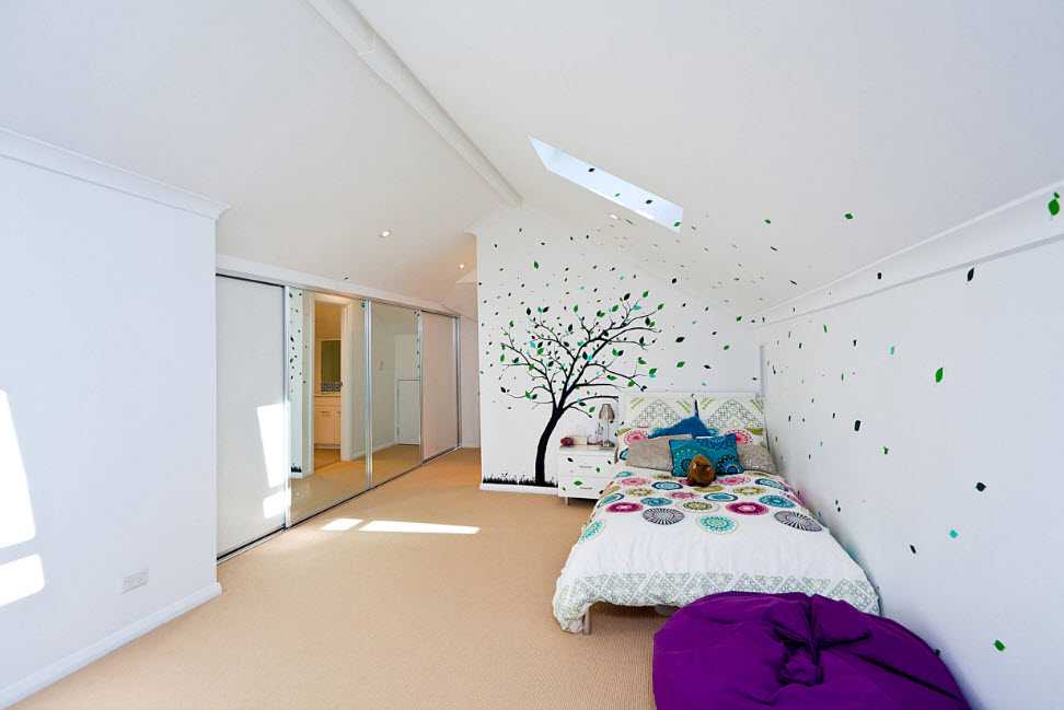 Такую комнату лучше обклеить обоями светлых тонов, сделав акцент на одной из стен, что придаст уюта. Акцент можно поставить в качестве яркого принта или фотообоев с проекцией в 3D, что поможет сделать помещение шире визуально.