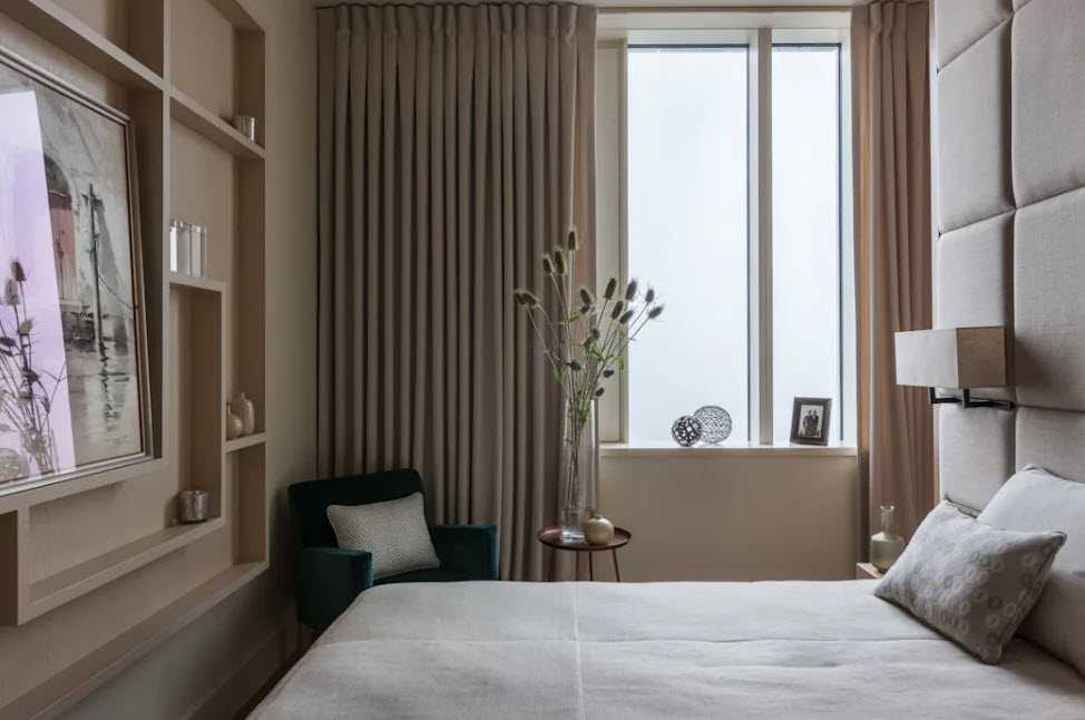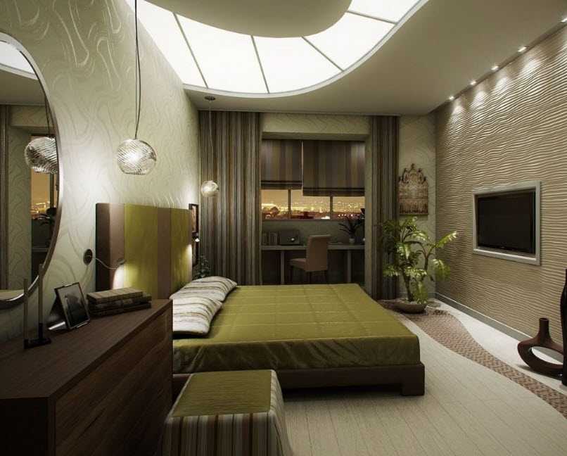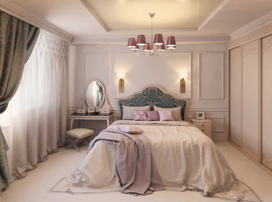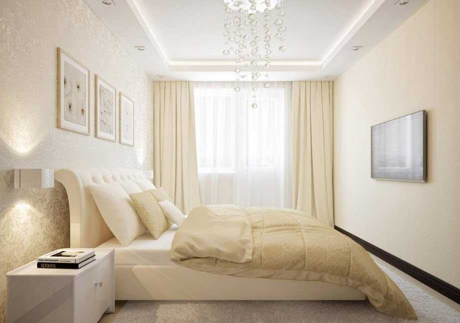 В числе оттенков узкой спальни, которые более предпочтительны: бежевый, кремовый, сиреневый, нежный оливковый, охристый, светло-серый, персиковый, фисташковый. Что касается потолка, его стоит сделать белым, либо нежно-кремовым, молочным, в зависимости от оттенка стен.