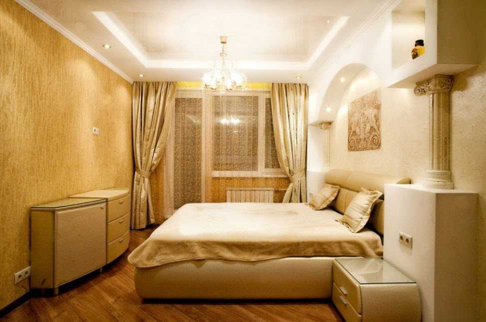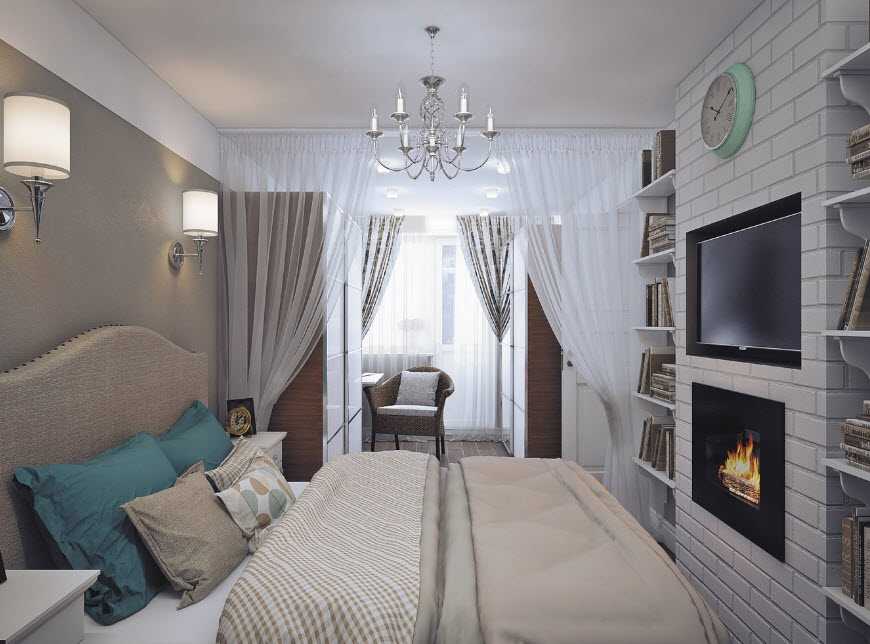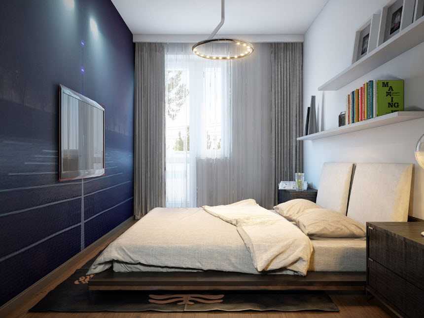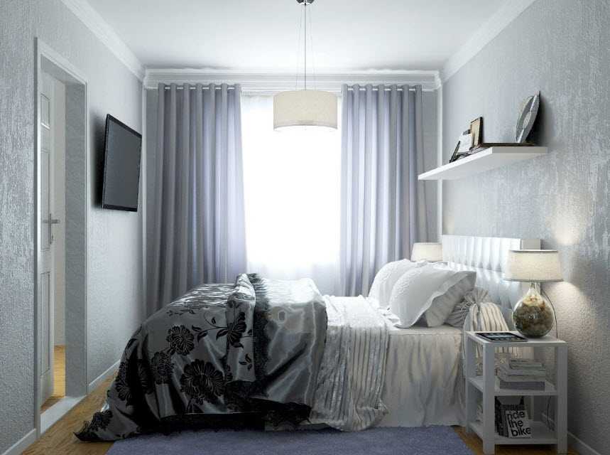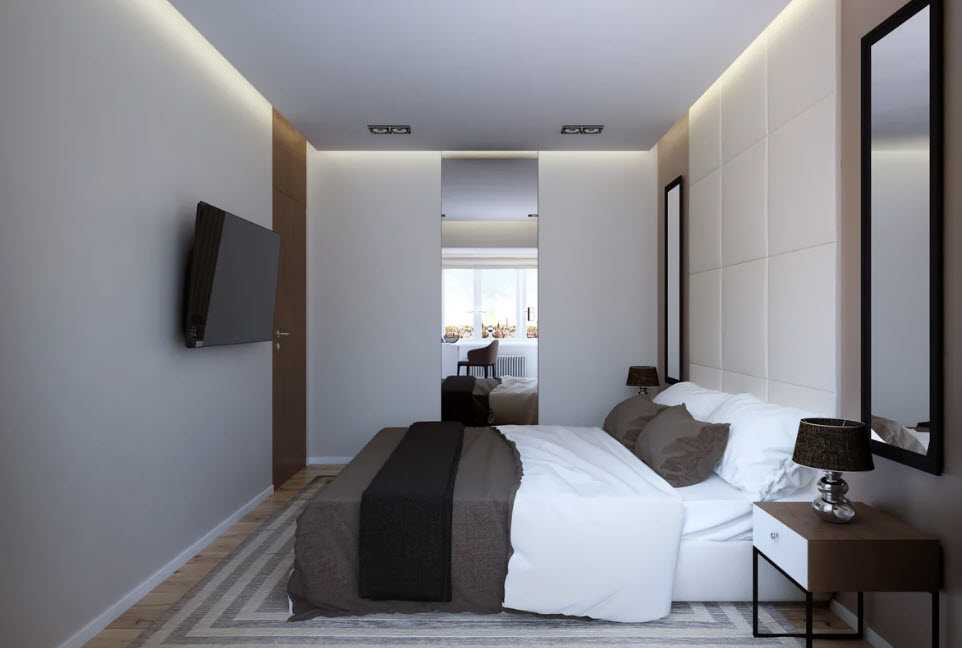 Ширина меньше 2,5 метров обуславливает либо встроенную кровать от стены до стены, либо односпальную или полуторную кушетку. Нередко встроенные кровати заменяют подиумами с ящиками. Матрас кладется непосредственно на корпус, плюс прибавляются места хранения.